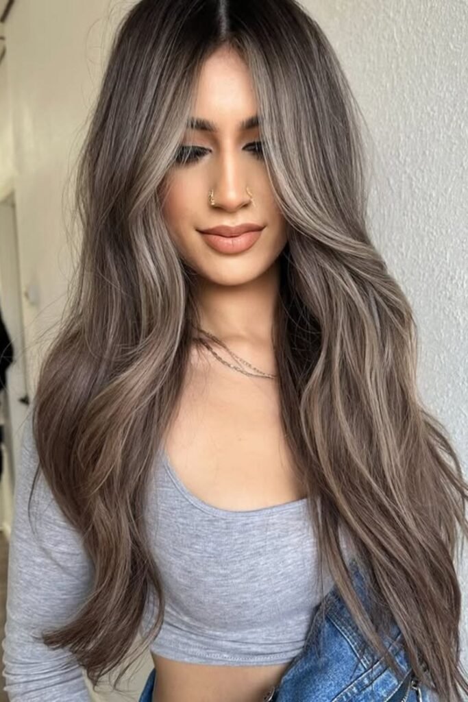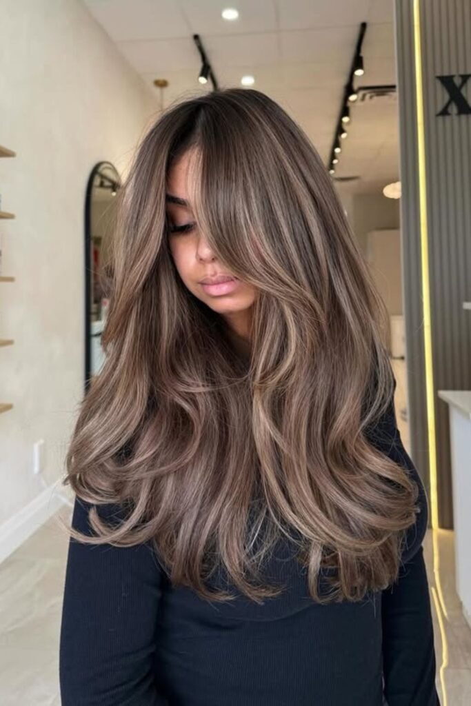 Subtle ash and caramel tones flow together here, giving the hair a lifted yet natural finish.
