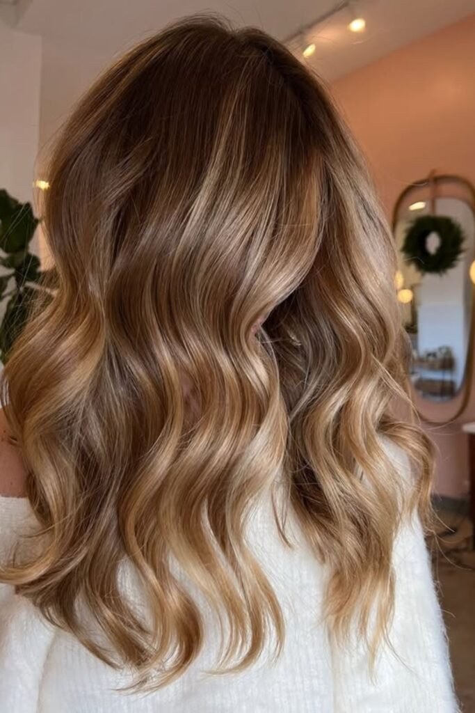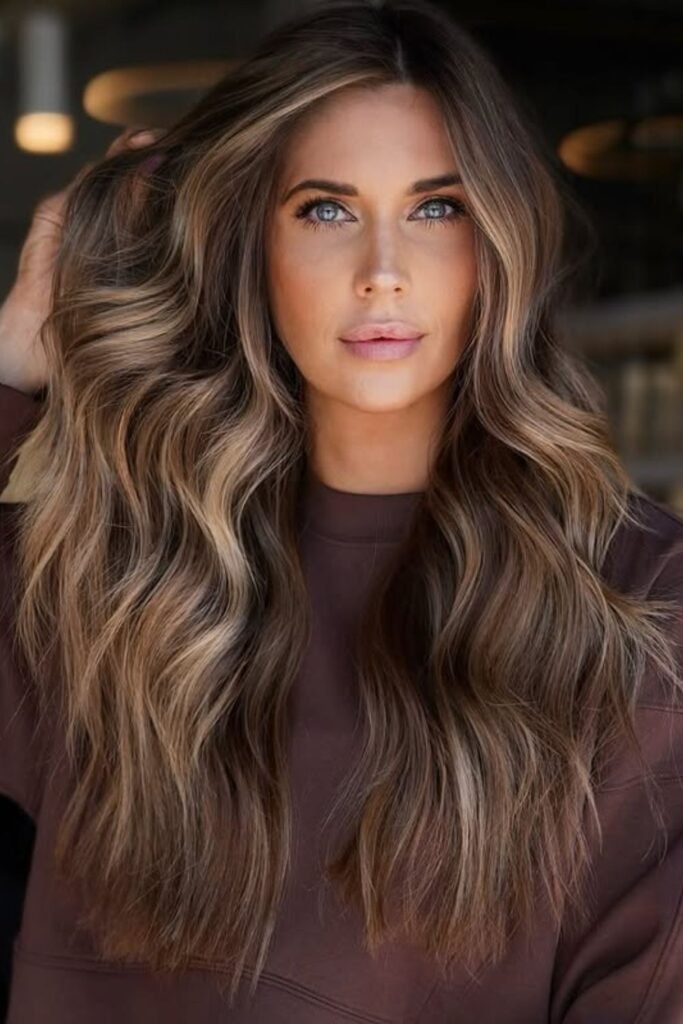 Soft mocha tones paired with caramel accents create the illusion of fullness and movement without harsh contrast.