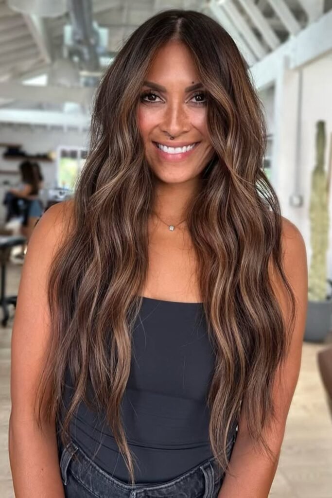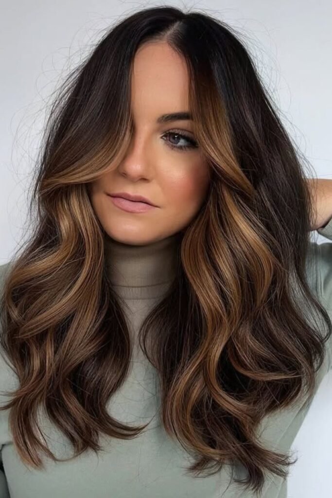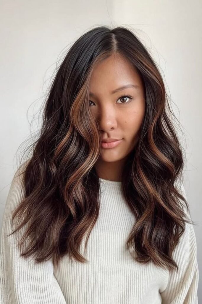 Ribbons of copper brown light up this dark brunette base, adding instant warmth and movement.