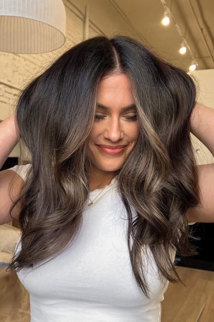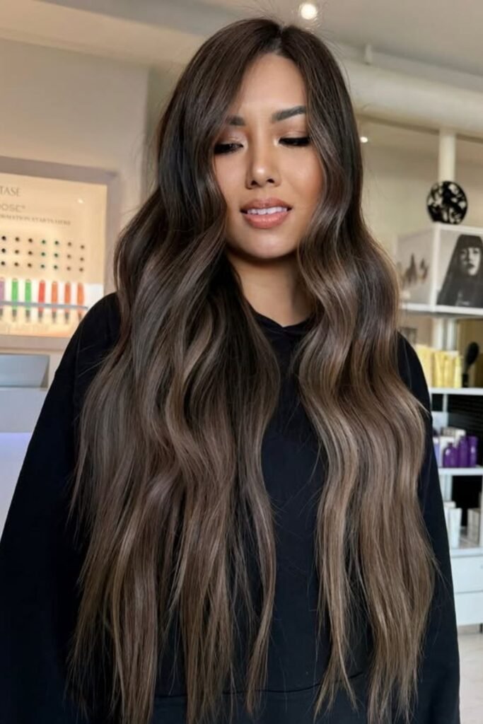 Deep espresso roots melt seamlessly into ashy brown mid-lengths, giving this look a modern, dimensional twist.