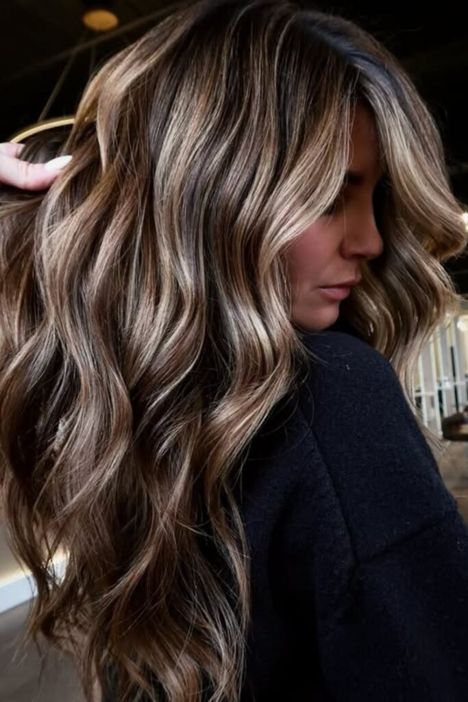 Balanced beige tones flow through a deep brunette base, creating a creamy, high-contrast blend that brightens the face without harsh lines.