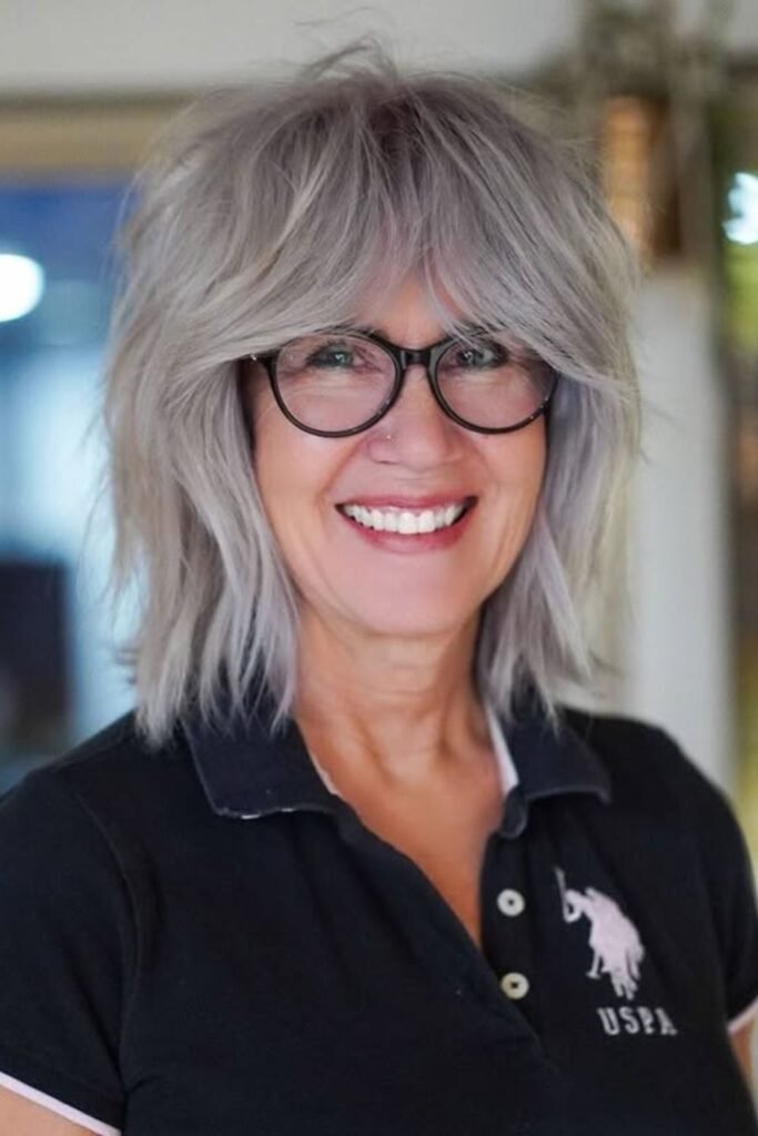The soft bangs naturally frame your glasses, making the look light and fun instead of heavy. Tell your stylist to add choppy layers throughthe crown.