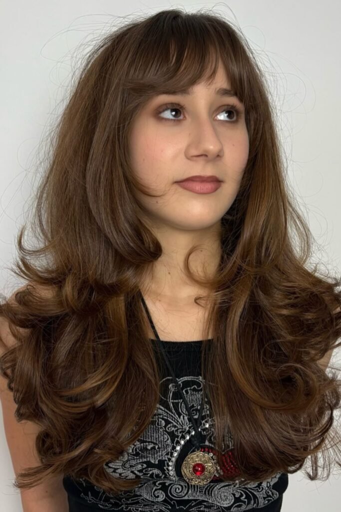 Lifted curtain bangs add height here, giving long layers a fuller shape without making the top heavy.