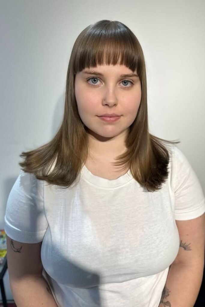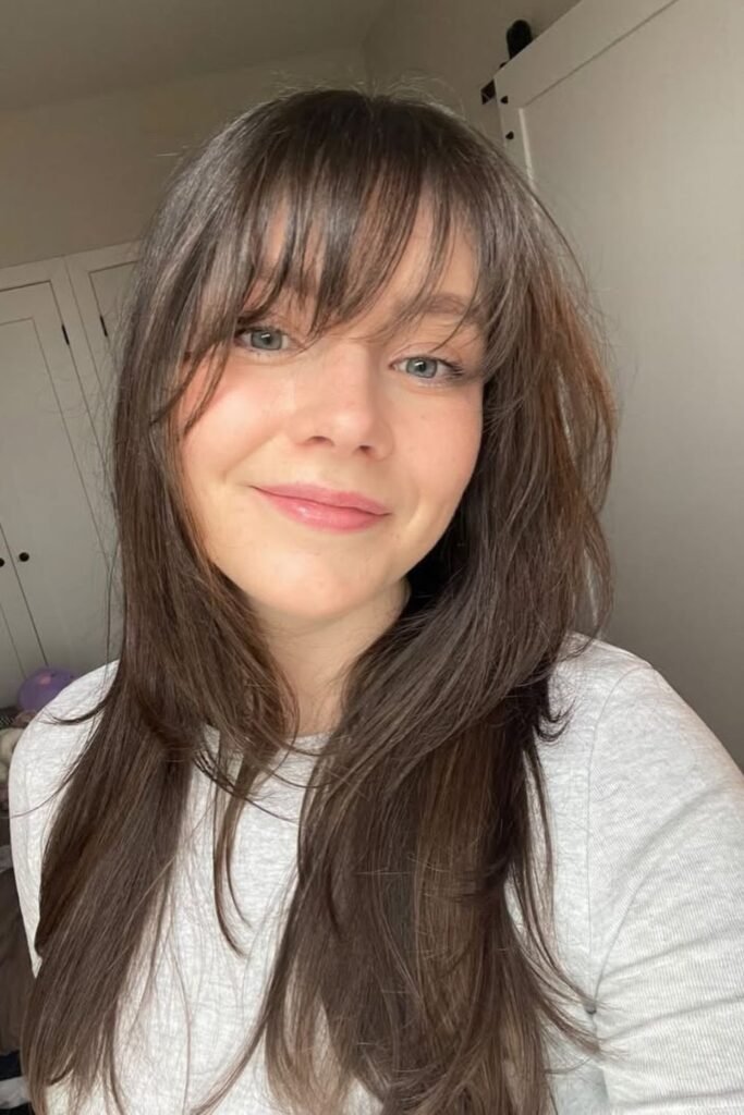 A clean, full fringe works nicely here because it sharpens the front while the long layers keep everything soft through the ends.