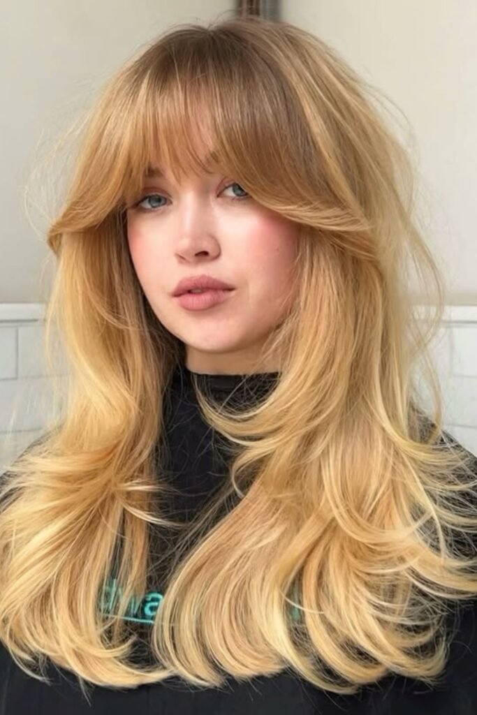 You get an easy face-softening effect here because the full curtain bangs blend straight into long, feathered layers. This is the best way to get movement without losing length.