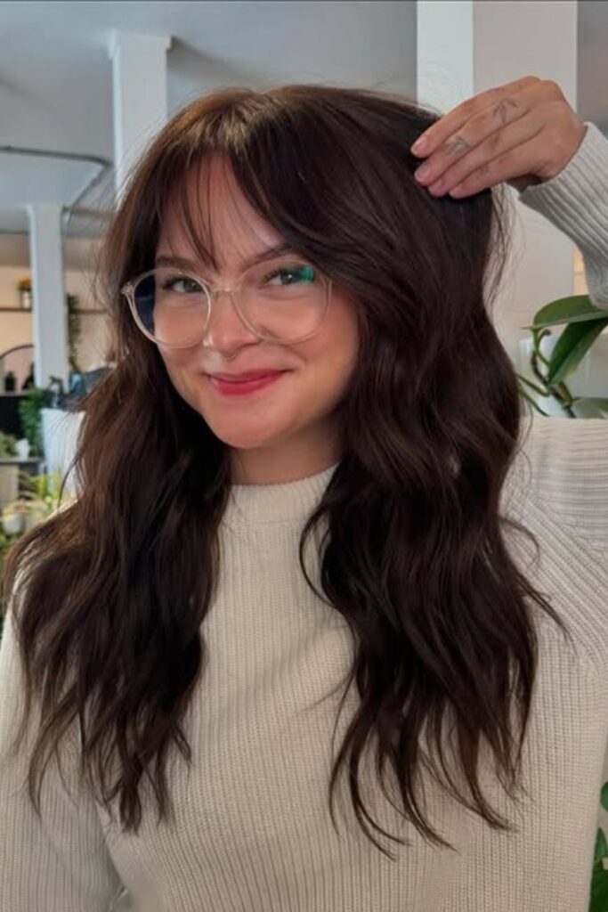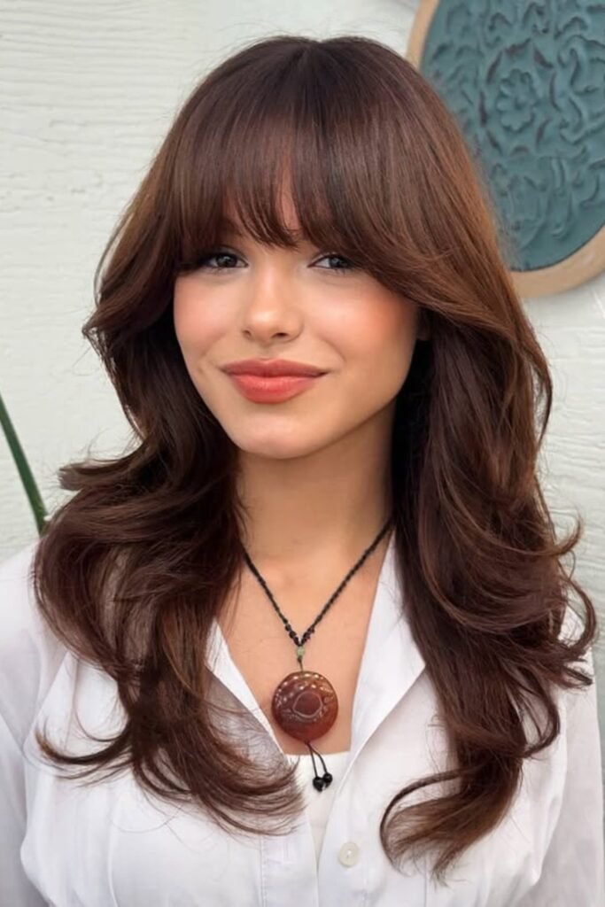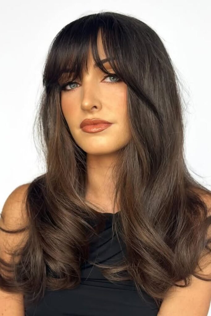 Heavy curtain bangs pair well with long, blown-out layers because they frame the eyes while giving the top extra lift.