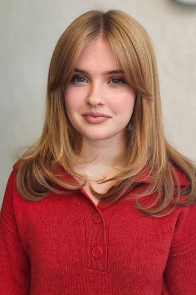 A gentle face opening happens here because the curtain bangs fall evenly on both sides and blend into rounded mid-length layers.