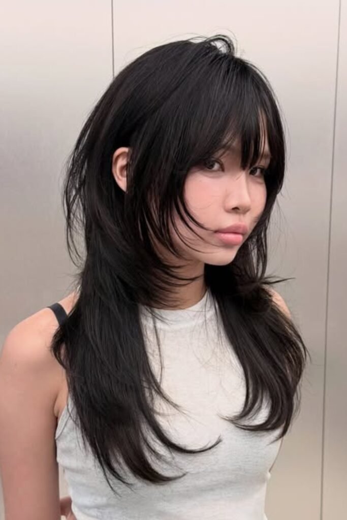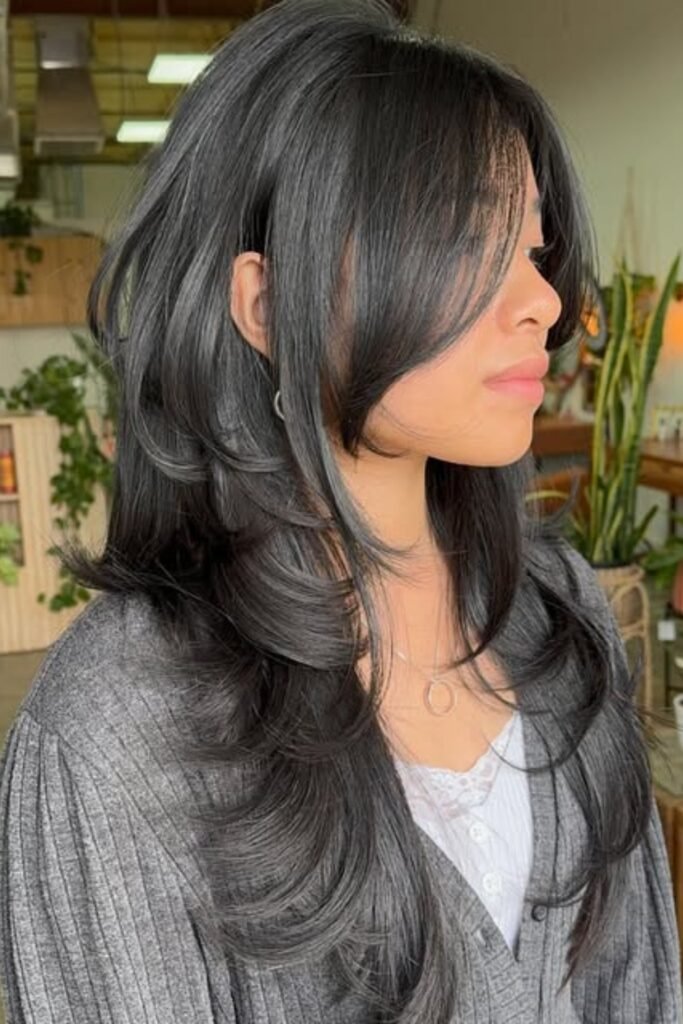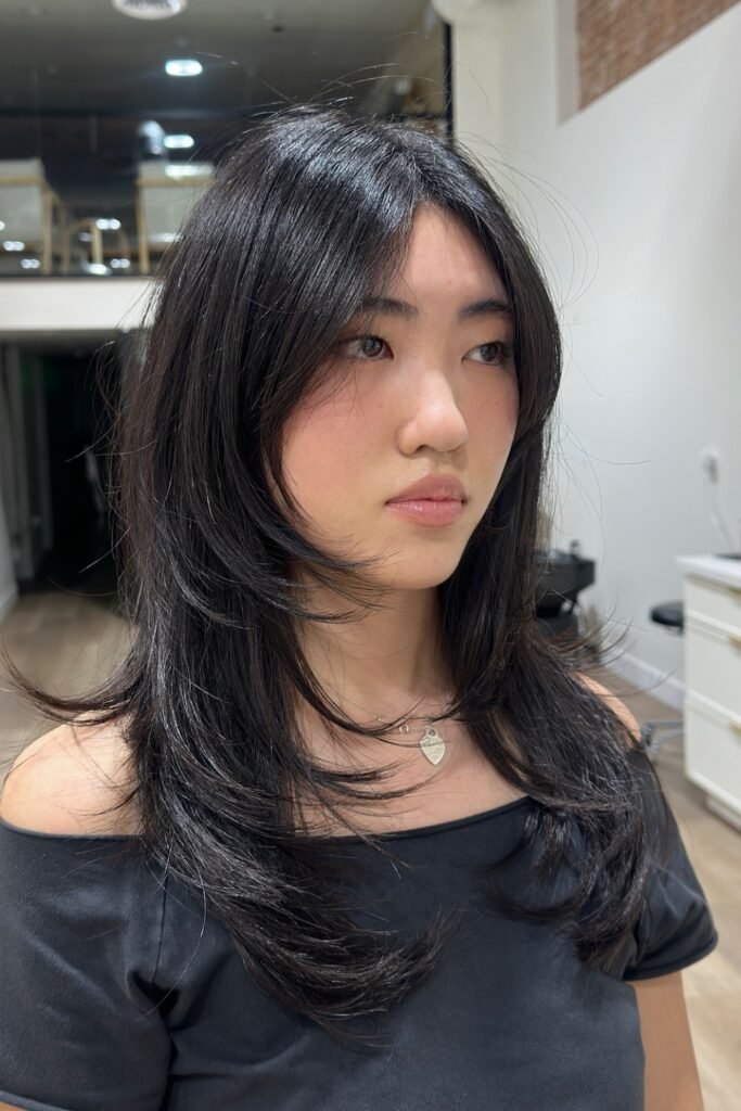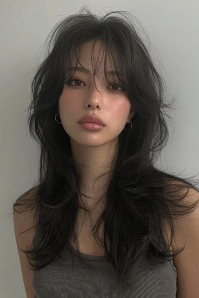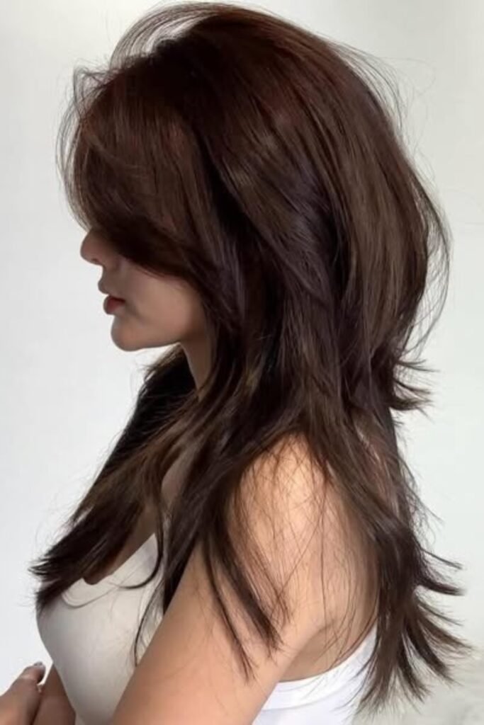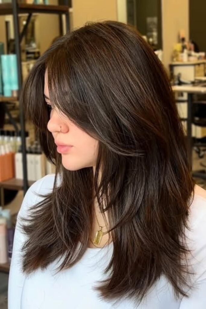 The lower layers remain sleek, the lengthy front pieces softly unfold around the cheeks.
