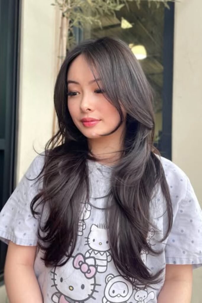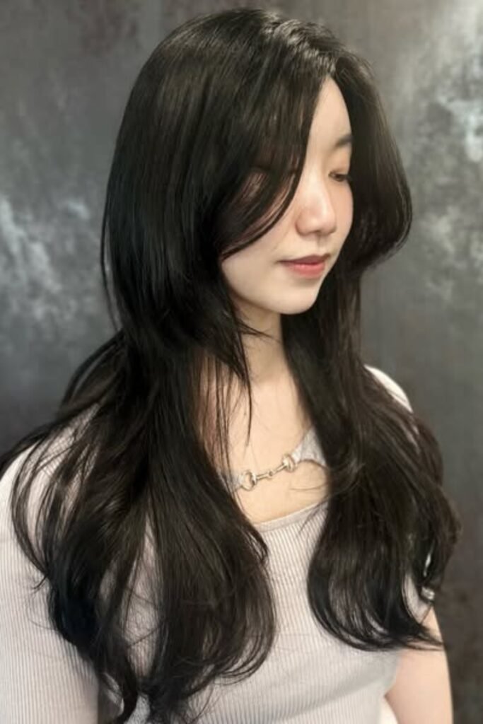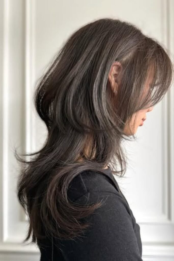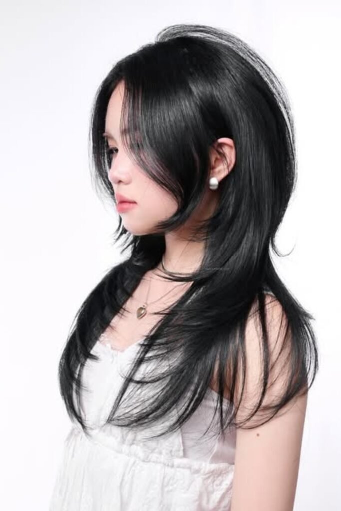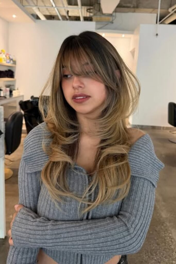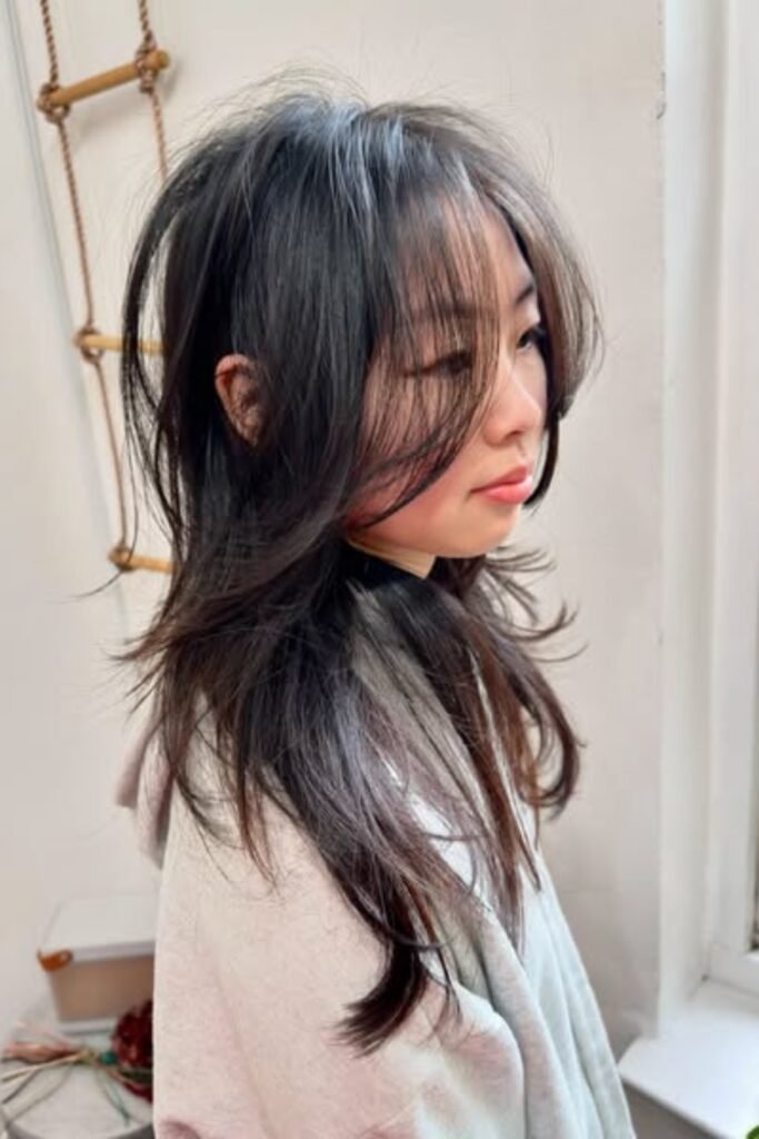 The lower layers remain sleek, the lengthy front pieces softly unfold around the cheeks.