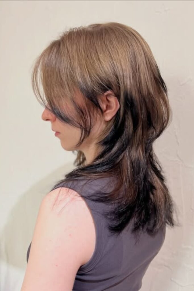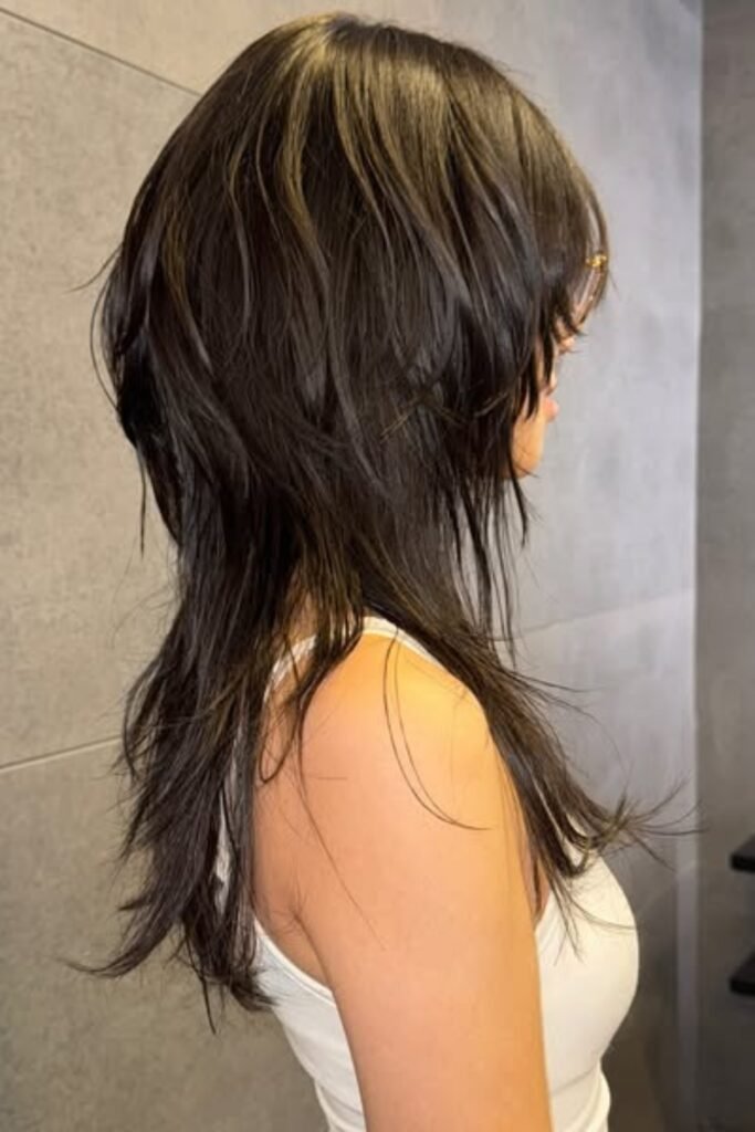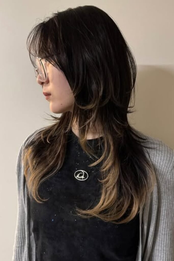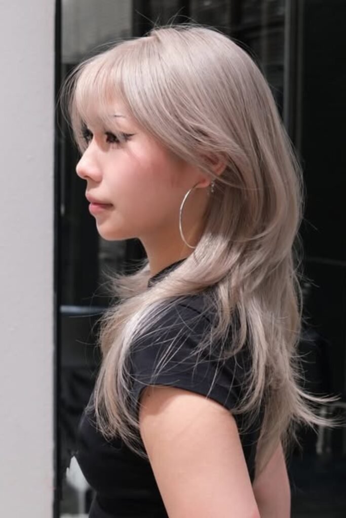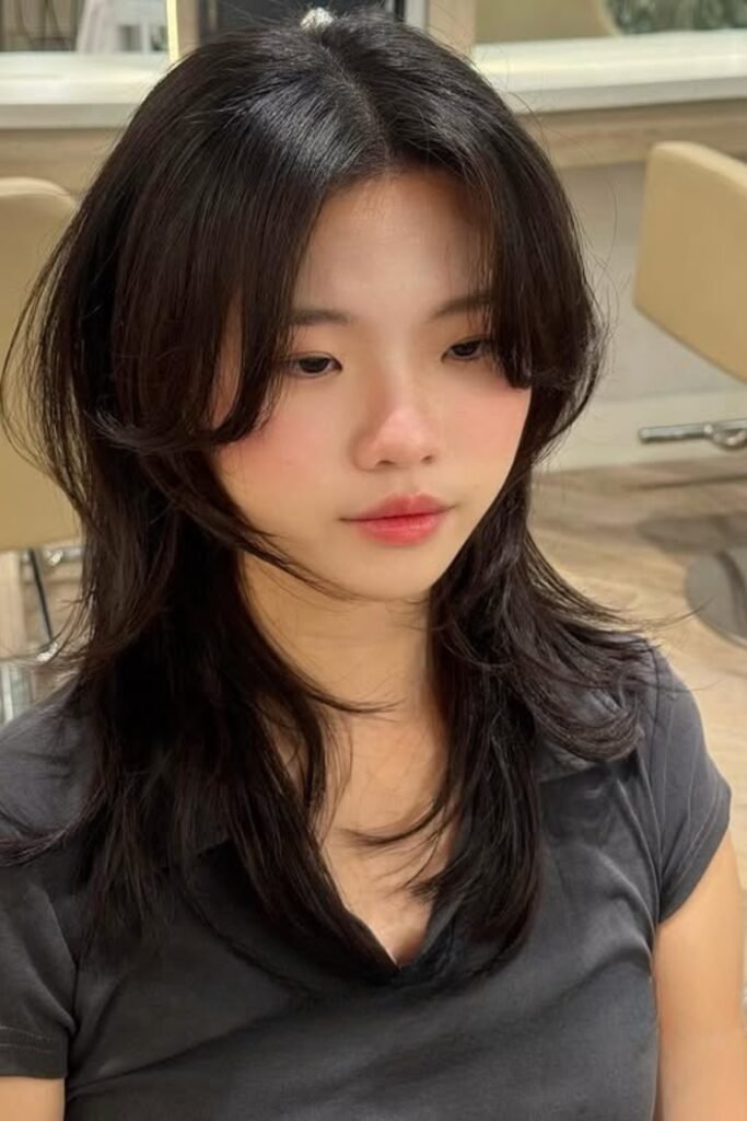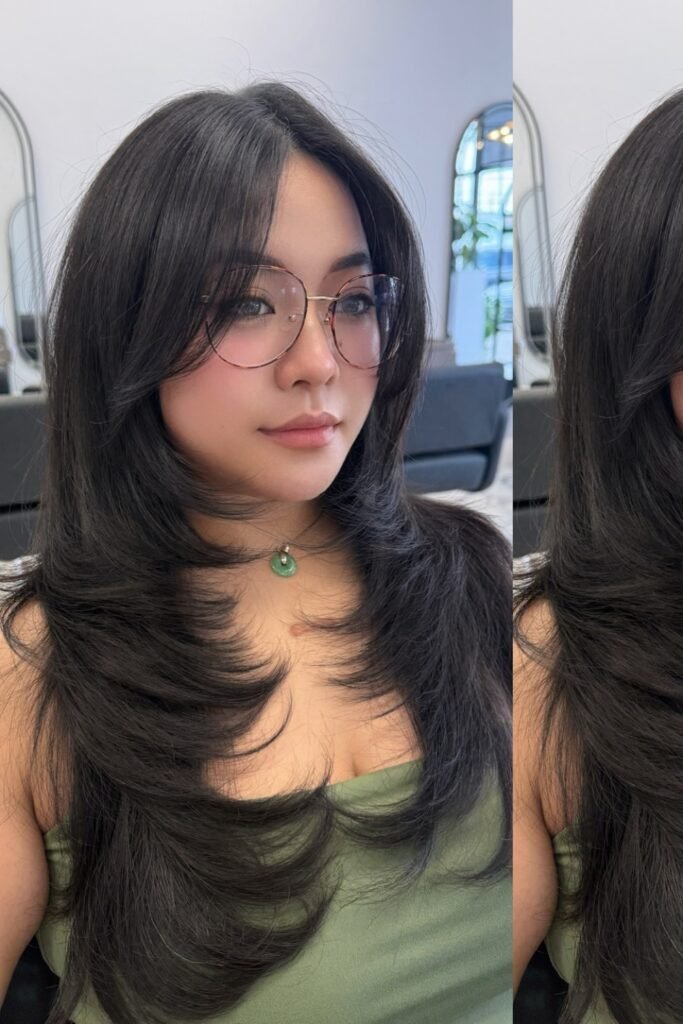 The lower layers remain sleek, the lengthy front pieces softly unfold around the cheeks.