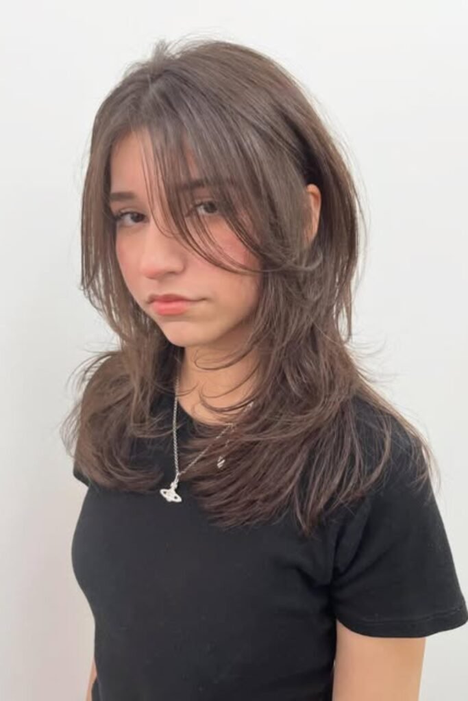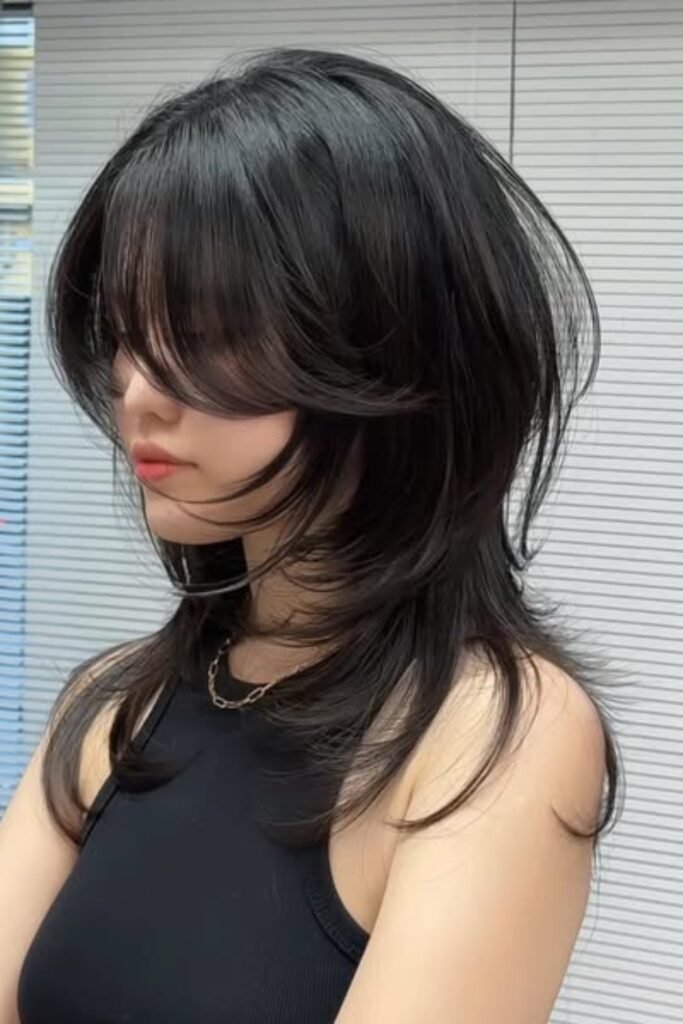 The lower layers remain light and feathery, while the front pieces gently fall along the cheek.