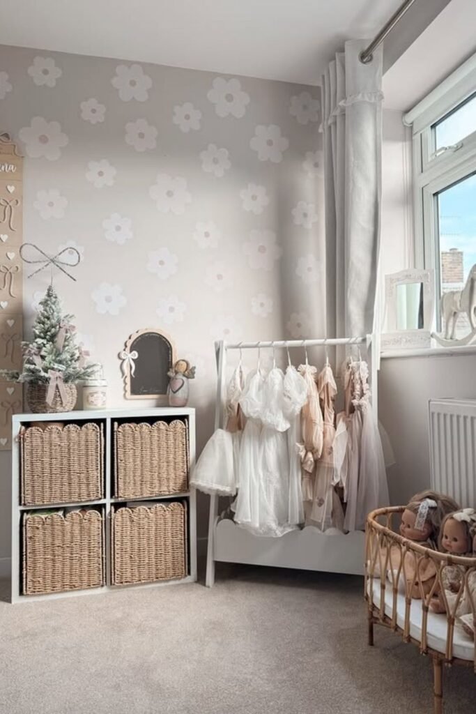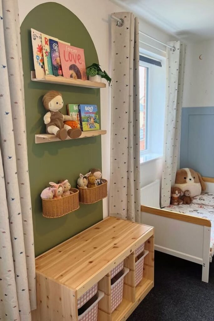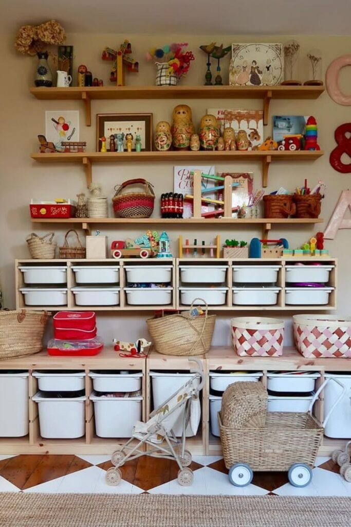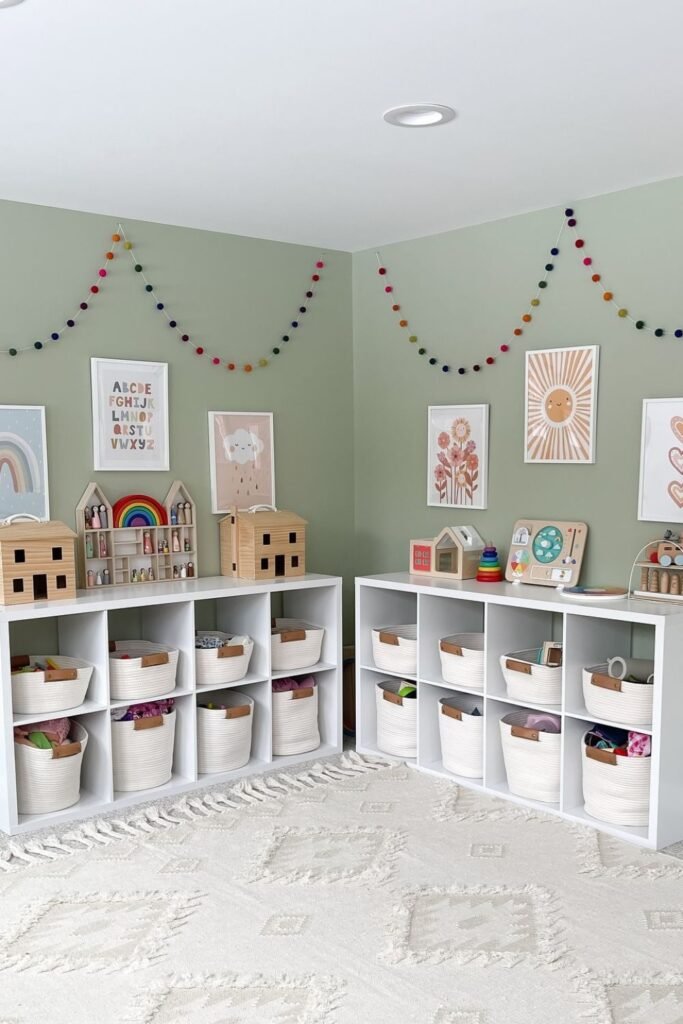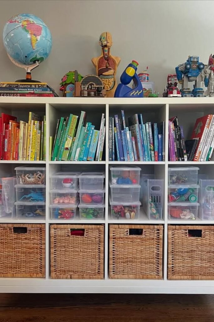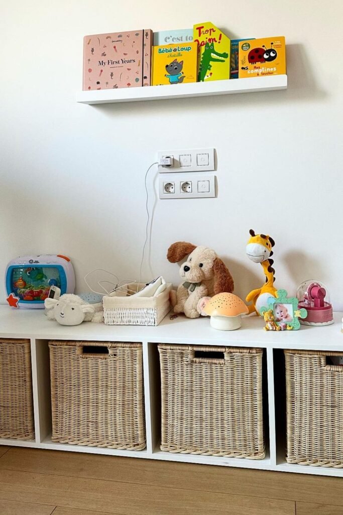 Baskets hide clutter without asking kids to sort perfectly which is why cleanup actually happens.