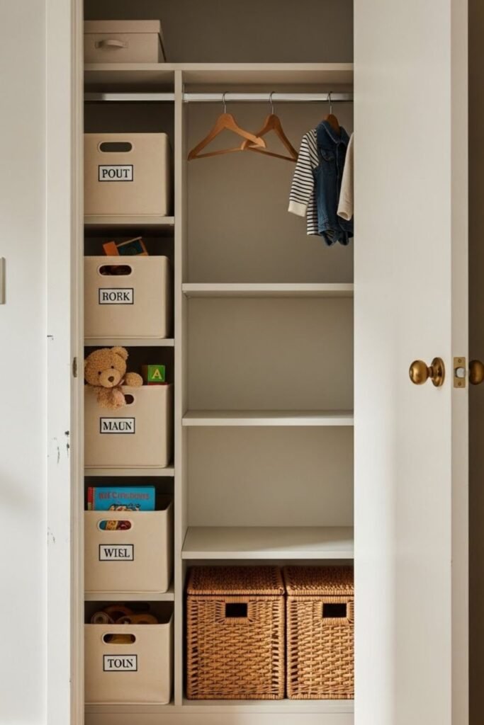Instead of organizing everything at once, limit what exists in the room. A rotation closet holds toys and books that aren’t currently in use.
