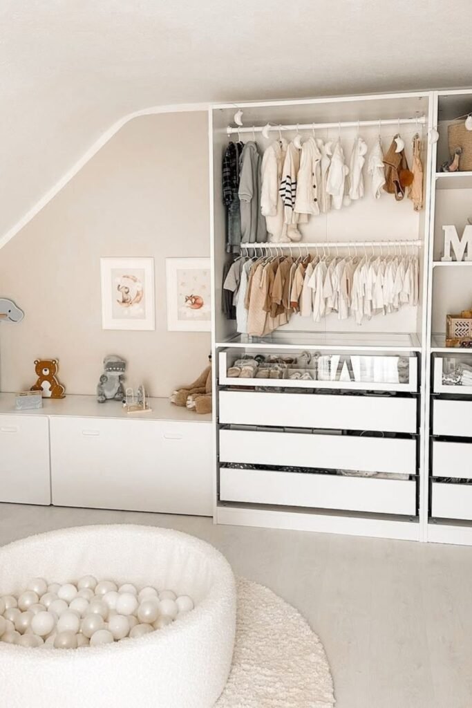 Slanted ceilings don’t have to kill storage. Turning the entire wall into a child-height wardrobe keeps clothes visible and easy to manage without cramming everything.