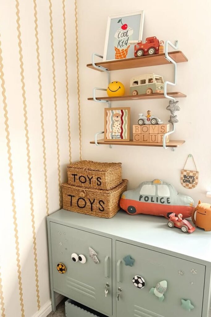 Wall-mounted shelves work best when they hold toys kids love but don’t need every minute.
