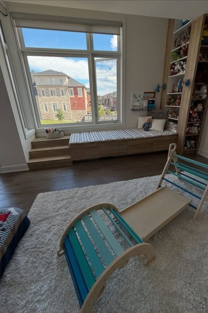 Seating becomes storage when the window wall does double duty. A built in bench like this keeps toys tucked away while giving kids a spot to read, rest or play quietly.