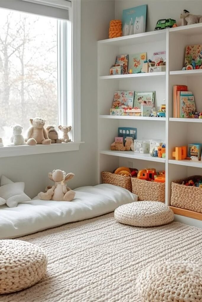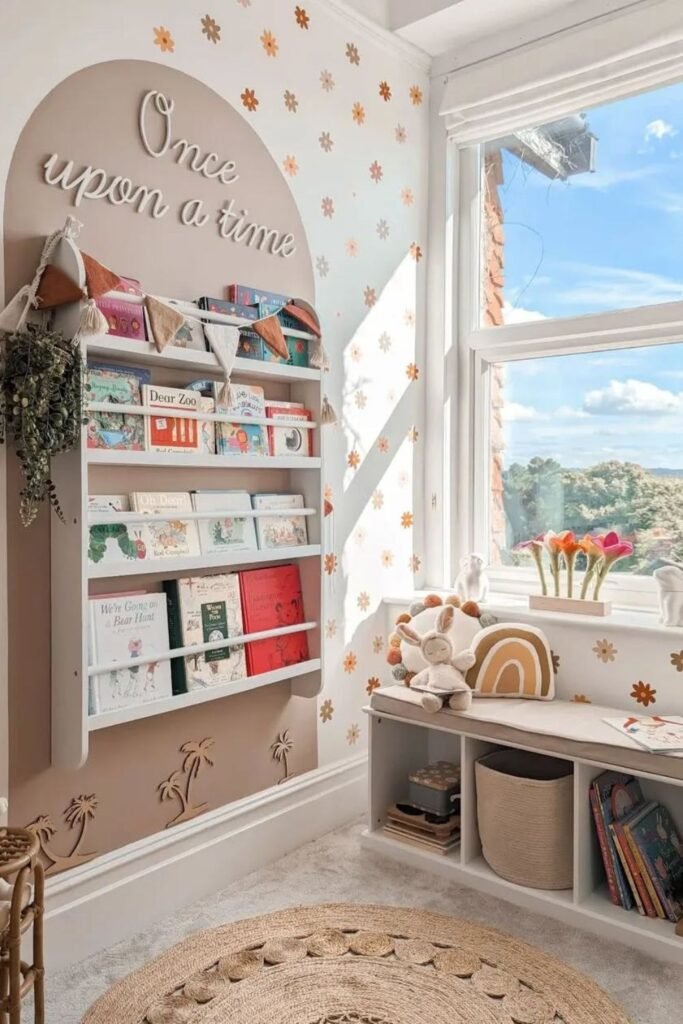 Storytime becomes part of the room when books live at eye level instead of tucked away.