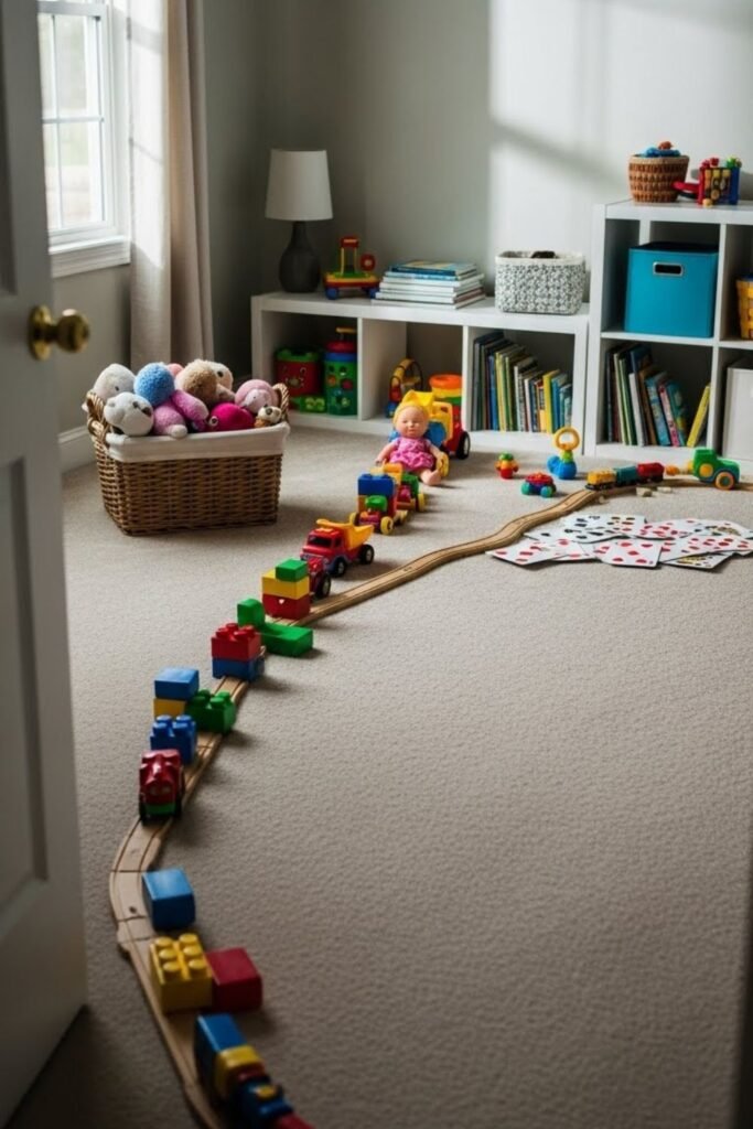 Most kids clean better when movement is involved. A floor reset path creates a simple cleanup flow. Start with one toggle basket near the door then shelves then bins.
