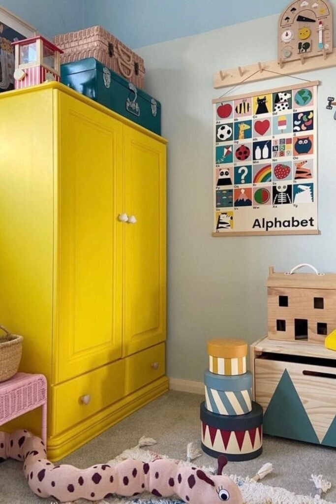 Bold furniture works harder when it hides everyday mess. A tall wardrobe like this keeps toys and clothes out of sight while using vertical space most rooms waste.