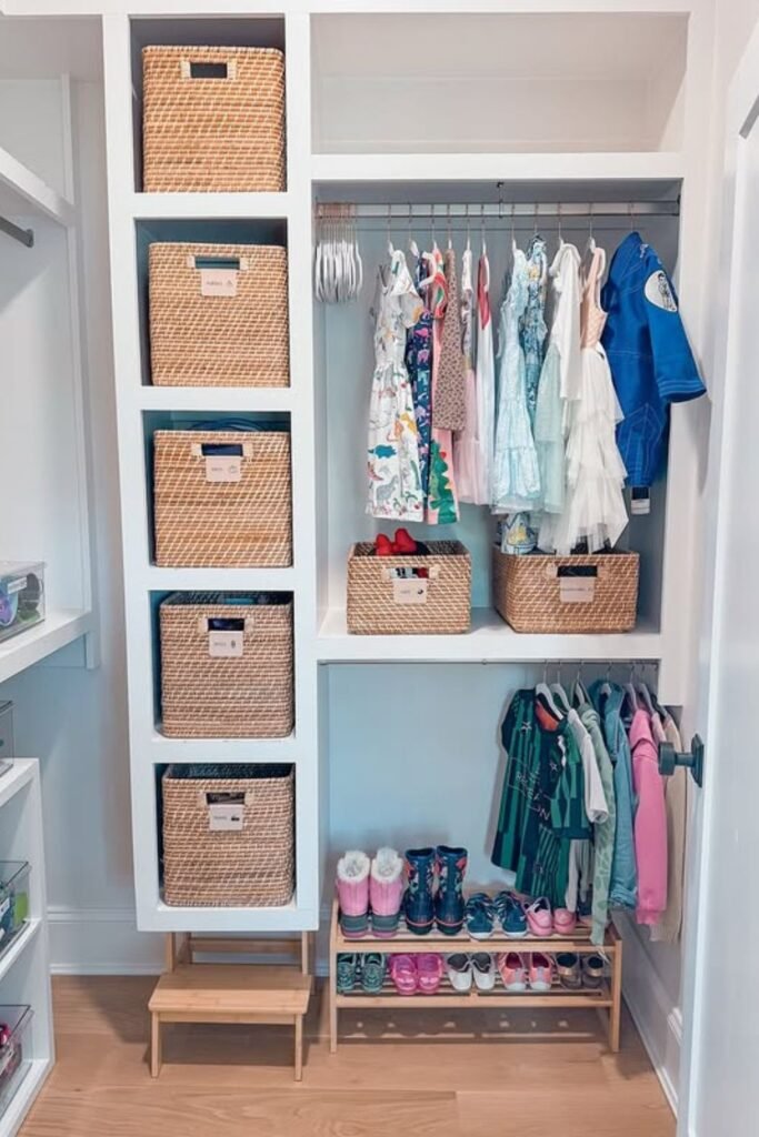 Morning chaos drops when clothes are sorted at a child’s height. Hanging rods placed low let kids grab outfits without digging.