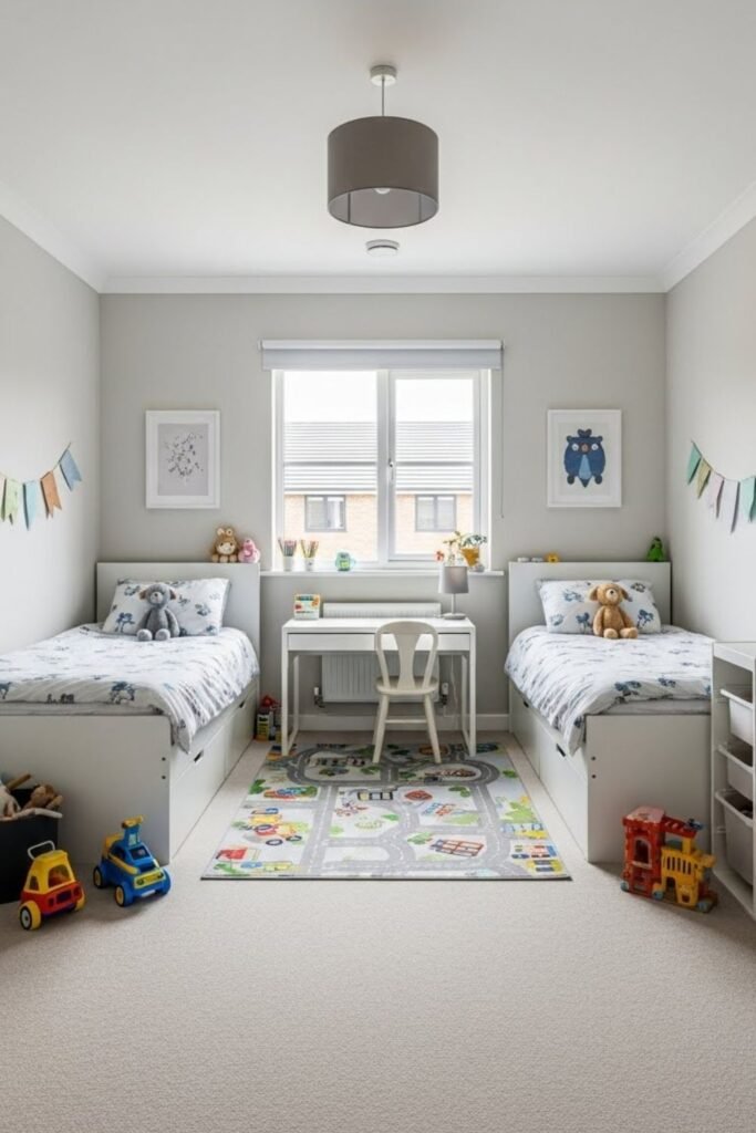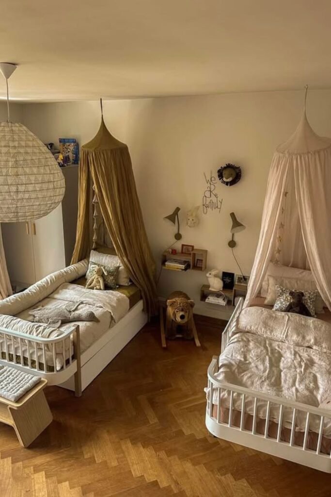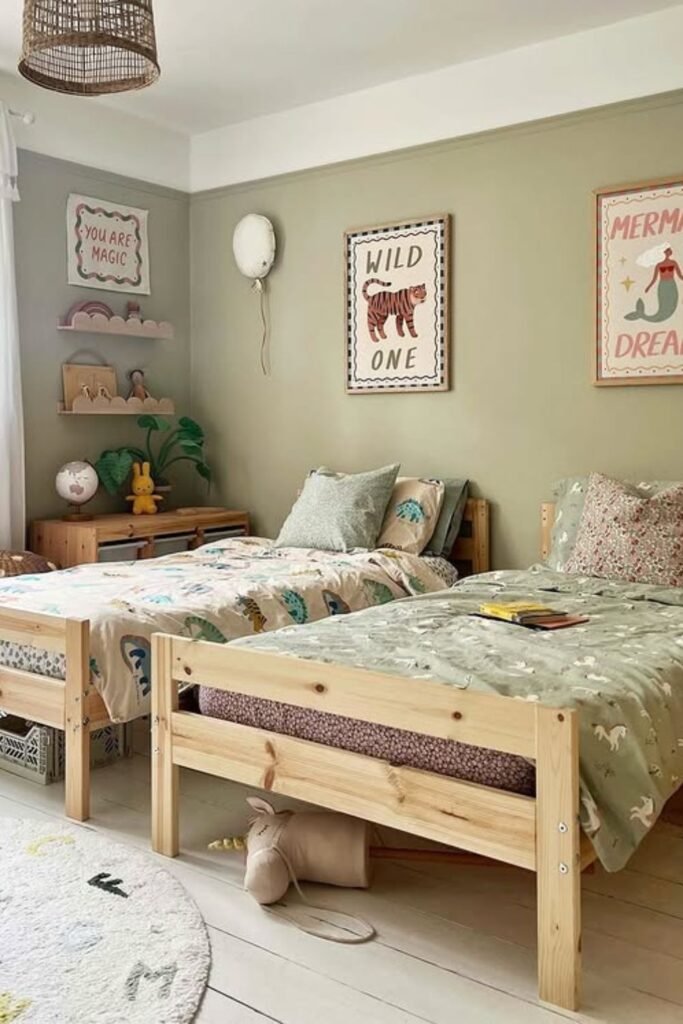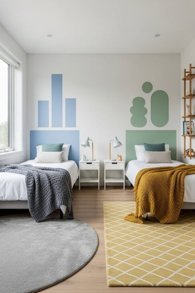 Shared rooms feel less overwhelming when each child has a visual anchor. One strong element like a wall color block, rug shape or ceiling detail signals personal territory.
