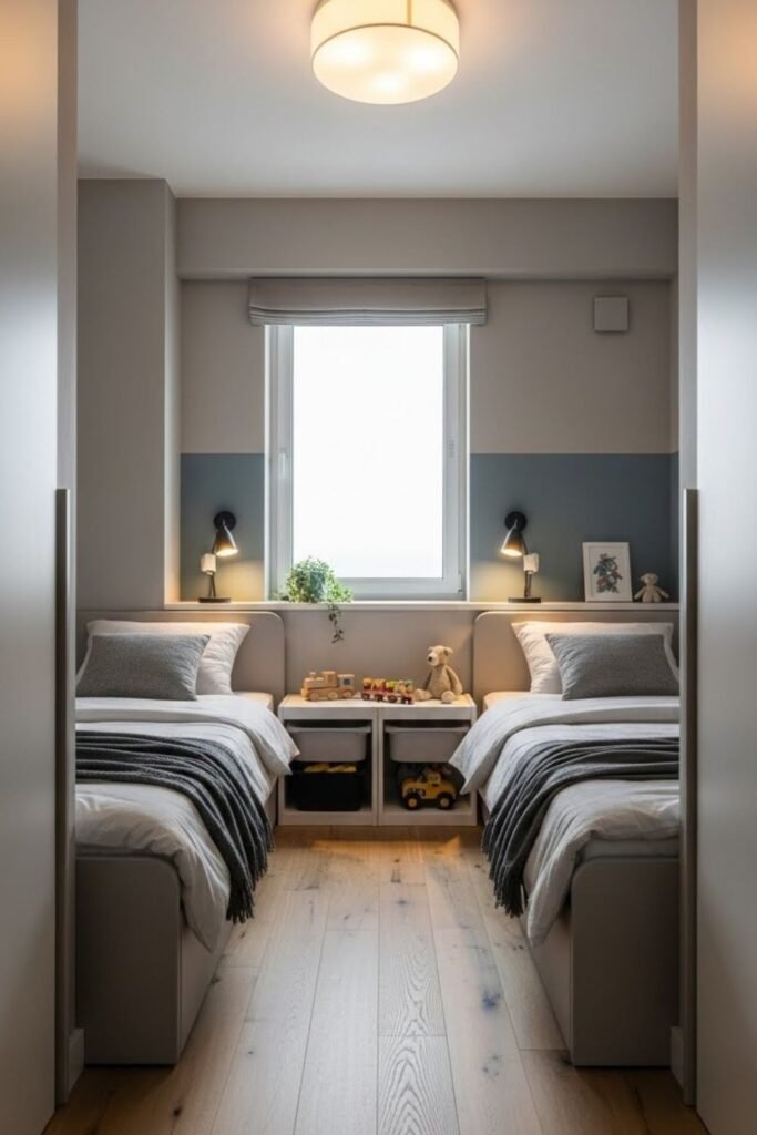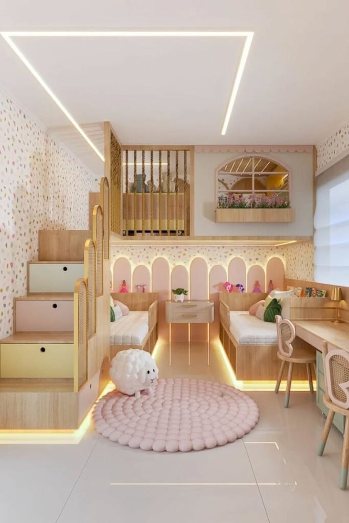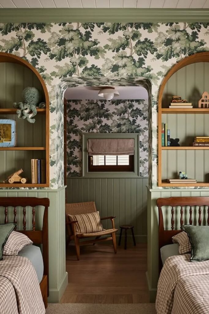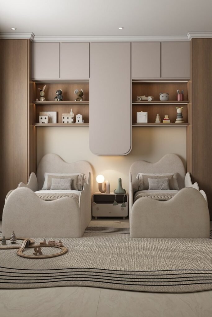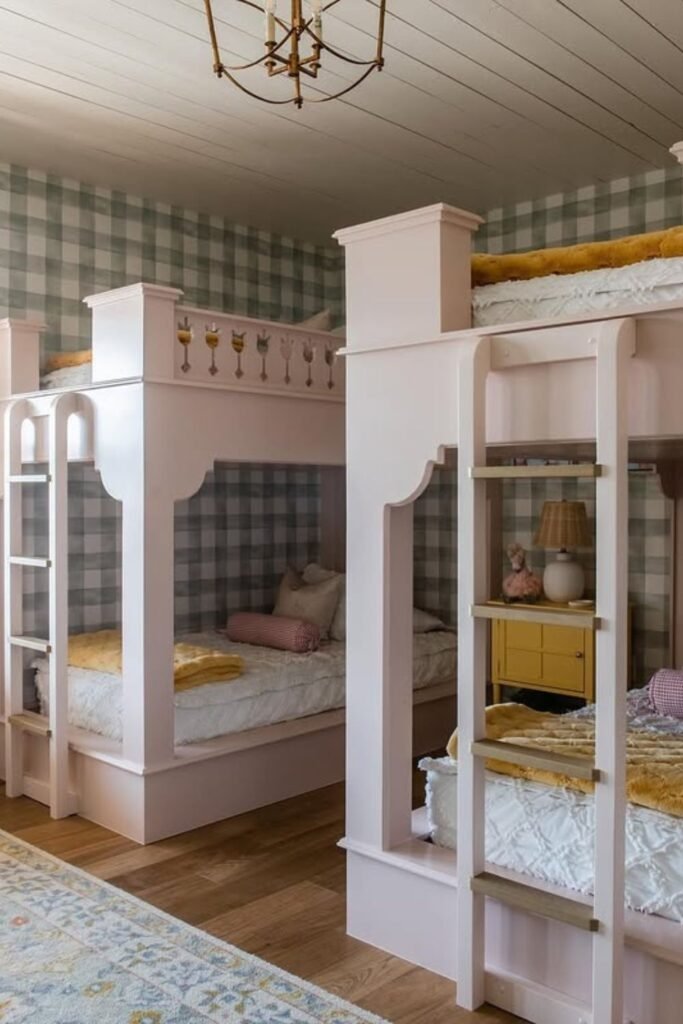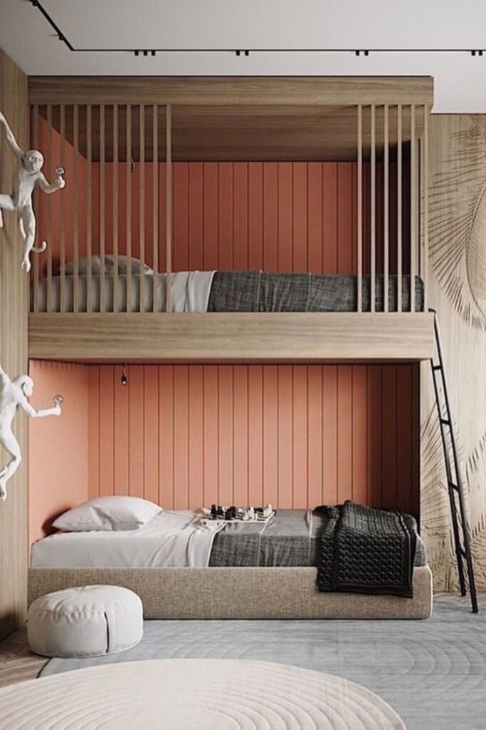 Built in alcoves turn shared sleeping into separate experiences. Each child gets the tucked away nook that feel quiet or personal even though the room stays open.