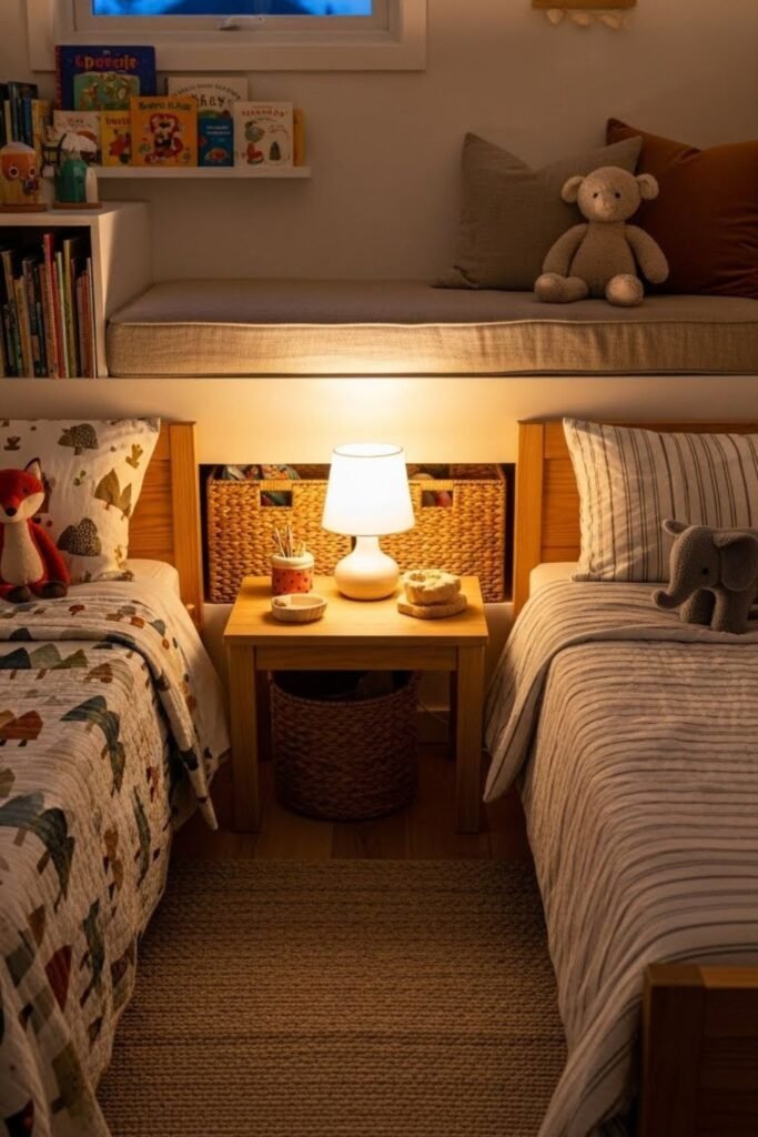A shared bedtime routine zone like a small reading bench or music corner creates connection without forcing closeness.