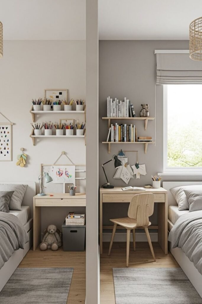 Nighttime sharing feels easier when daytime needs stay separate. One side of the room supports play and creativity.