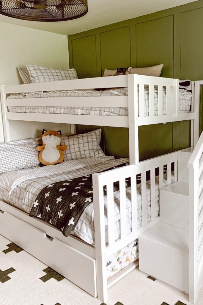Vertical sleeping solves more than space problems. One child stays grounded while the other gets a tucked away upper spot which naturally reduces bedtime distractions.