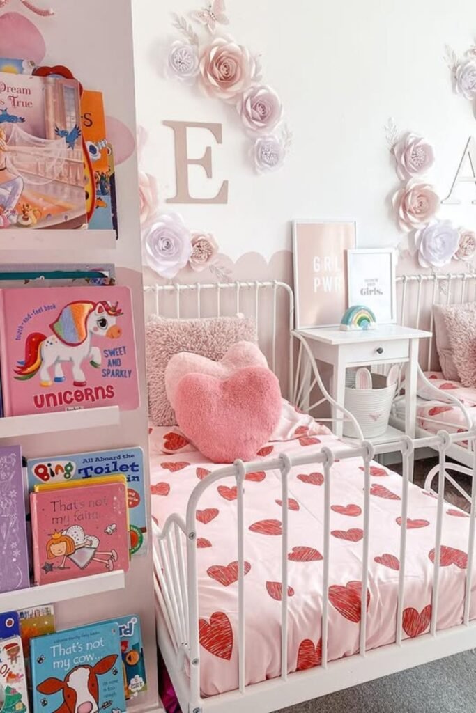 Soft colors can do the dividing without adding barriers. Each bed feels personal through wall details, bedding and initials even though both sit close together.