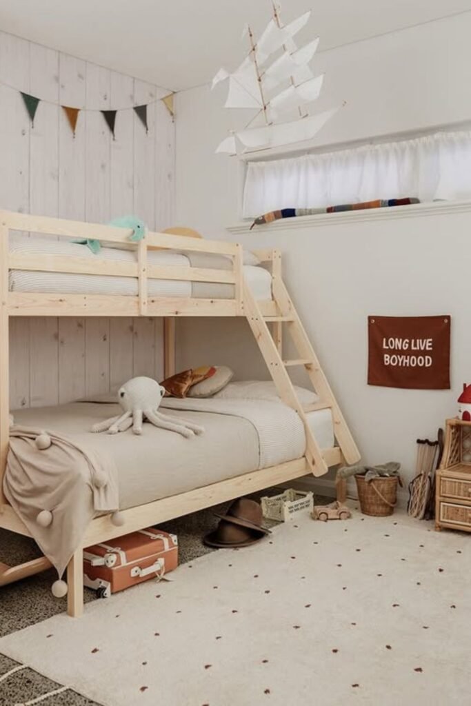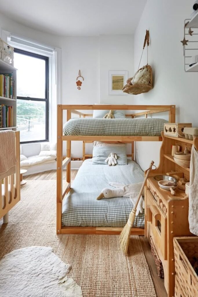 Built-in bunks bring order without making the room feel crowded. Sleeping stays contained in one vertical zone, which frees the floor for play and movement.