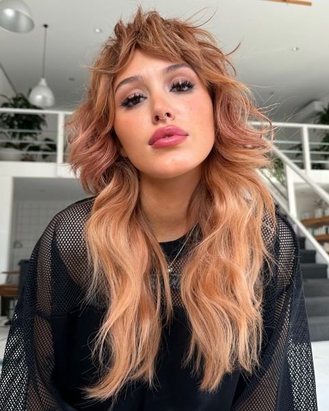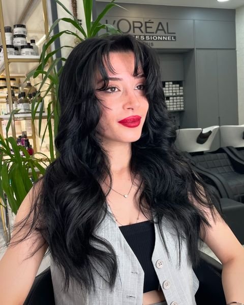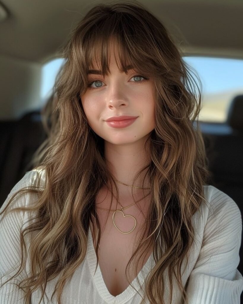 This look features voluminous, textured waves paired with soft, airy bangs that create a delicate frame. For styling, use a volumizing mousse at the roots, a curl-enhancing cream for the waves, and finish with a texturizing spray to emphasize the layers while keeping the look natural and effortless.