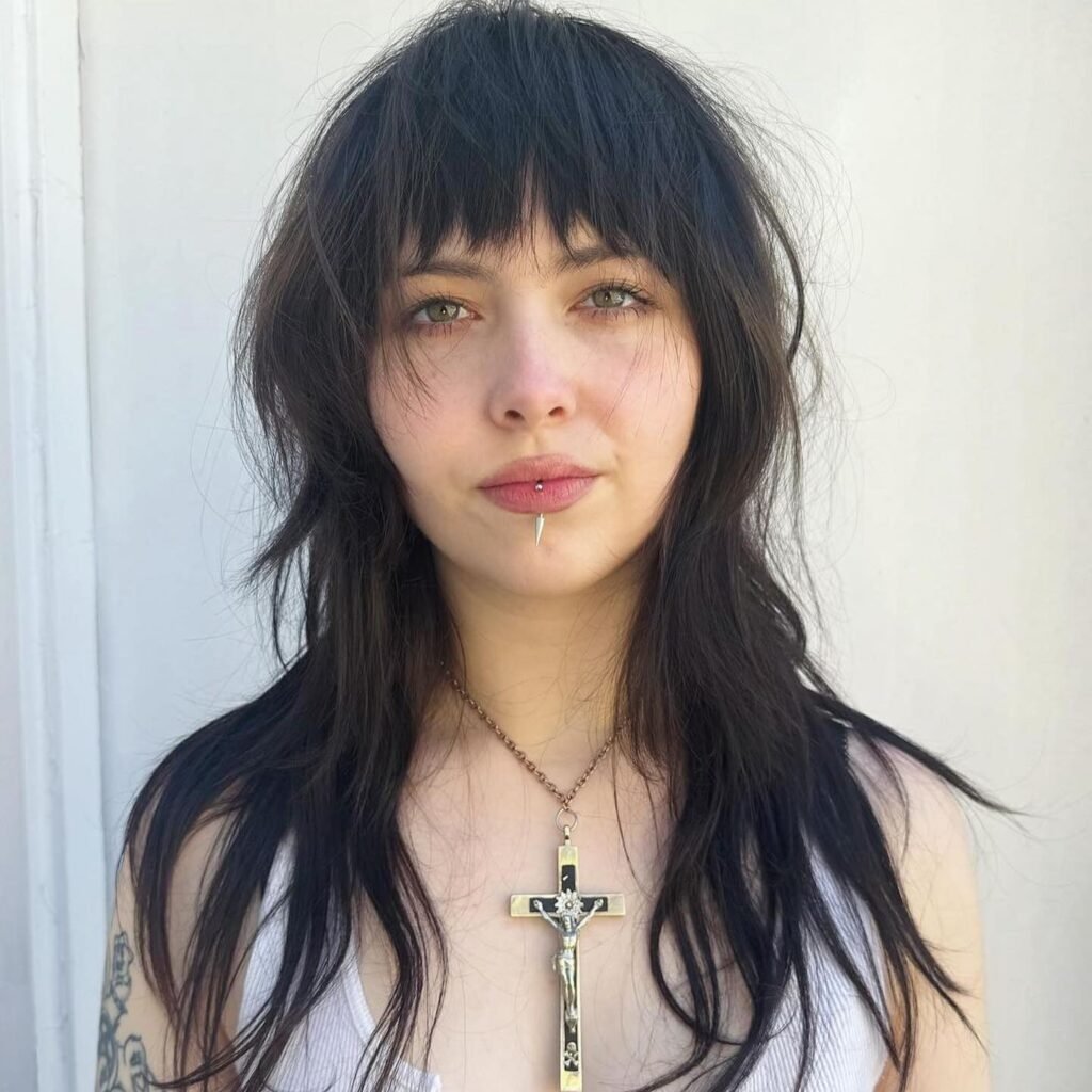 This is a more rebellious version with choppy, uneven bangs and razor-cut layers. Ideal for those who want a bold, grungy vibe. To style it, apply matte hair wax to define the layers and bangs, followed by a dry shampoo for added texture and a lived-in look.