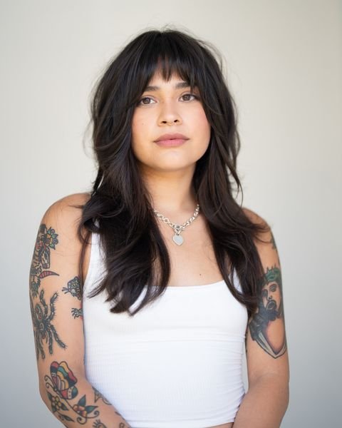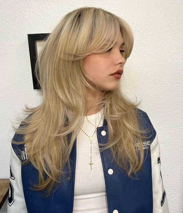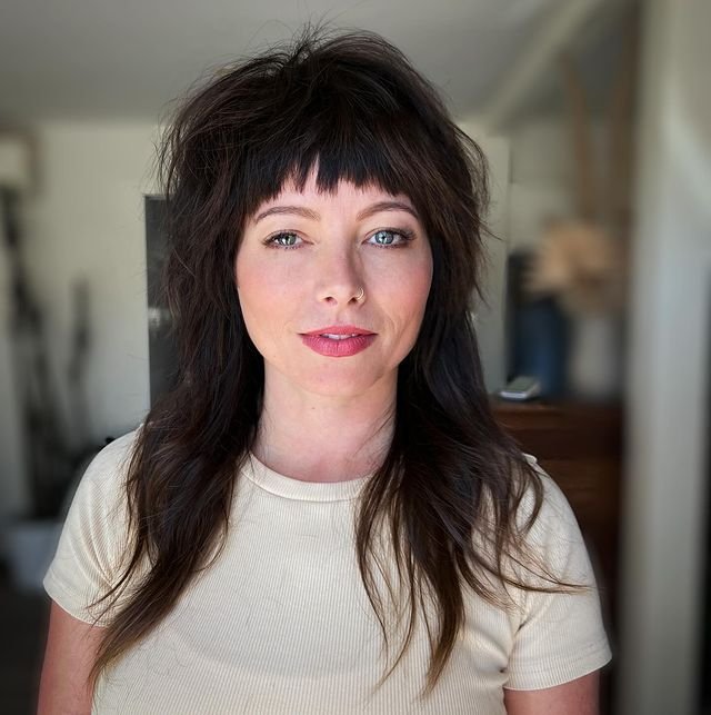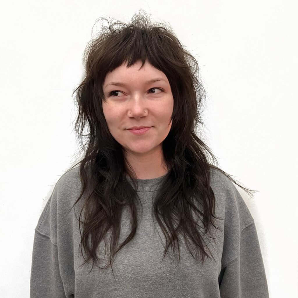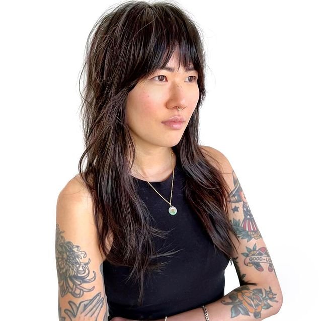 This textured shag features blunt bangs paired with voluminous layers throughout. For a voluminous finish, apply volumizing mousse at the roots and use a blow dryer for extra lift. Finish with a texturizing pomade to add structure to the bangs and layers, giving the cut its modern, edgy flair.