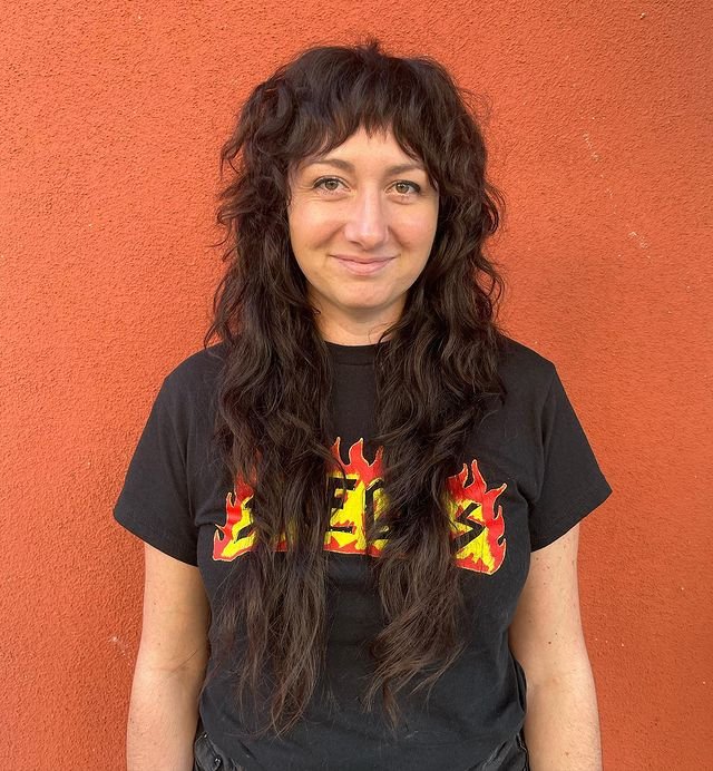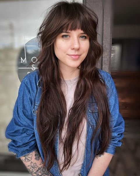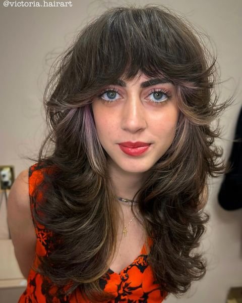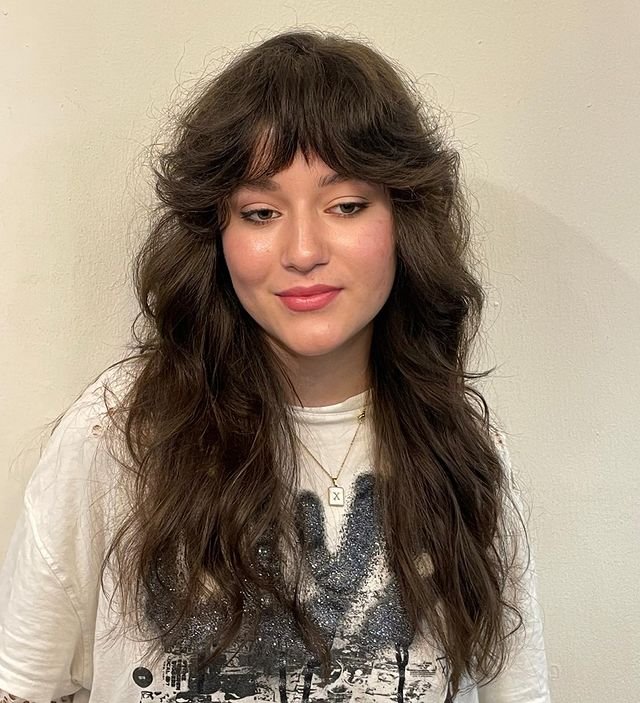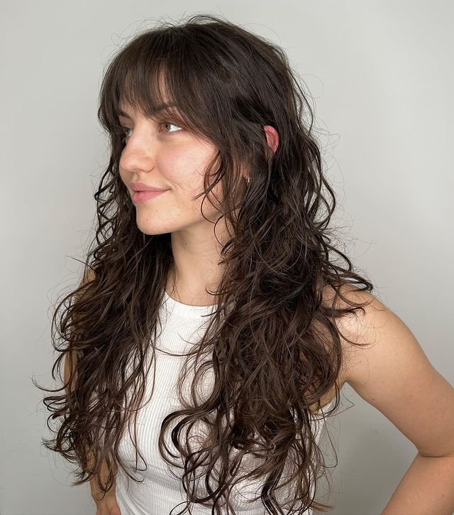 This long shag emphasizes natural curls with soft layers and face-framing bangs. To achieve this look, apply curl mousse to damp hair and use a diffuser to dry. Add a shine serum to prevent frizz and enhance curl definition for a glossy, voluminous finish.