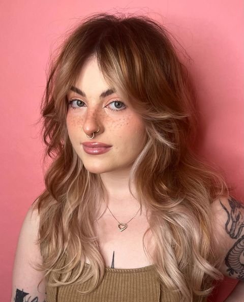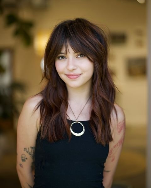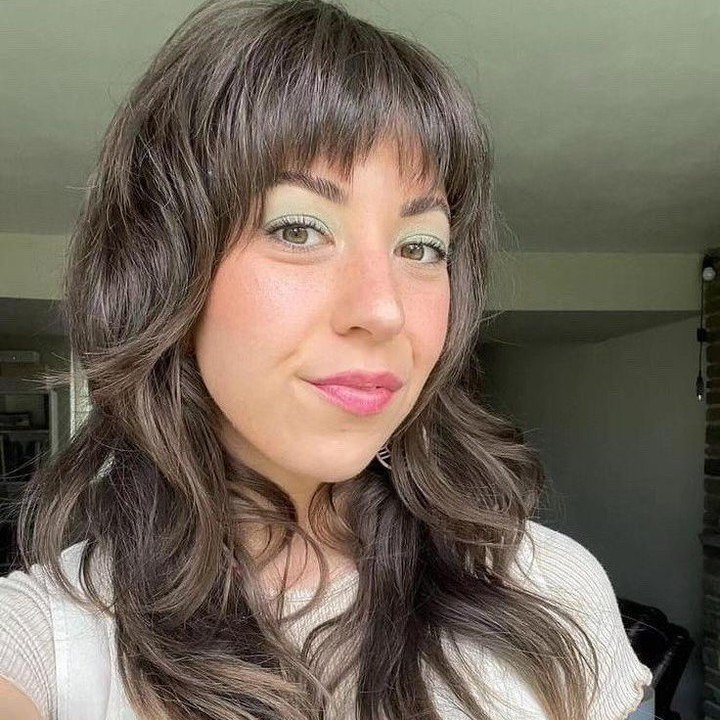 This style combines soft waves with shaggy layers and subtle bangs. To create this look, apply curl-enhancing mousse to damp hair and use a diffuser to define the waves. Finish with a texturizing spray to give the layers movement while keeping the bangs softly framed around the face.