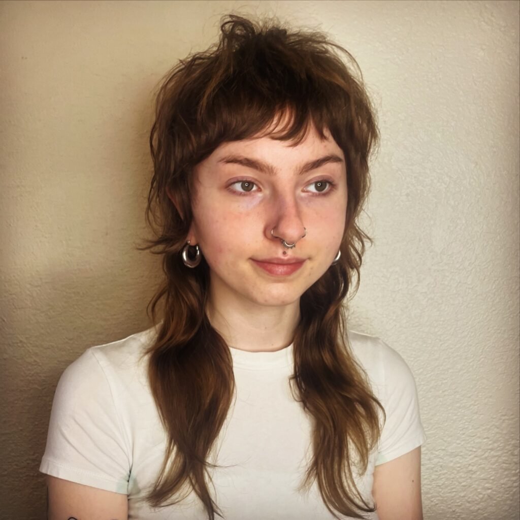 This messy shag offers a laid-back look with uneven, short bangs and soft layers throughout. Use matte pomade to enhance the texture and finish with a dry shampoo to keep the look fresh and give it a slightly lived-in feel. It’s perfect for those who love a low-maintenance style.