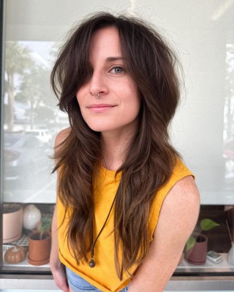 This long, layered shag with side-parted bangs creates a natural, flowy silhouette with soft waves. Use a volumizing mousse at the roots before blow-drying with a round brush to lift the layers. For definition, use a texturizing spray to emphasize the layers and add movement throughout the hair.