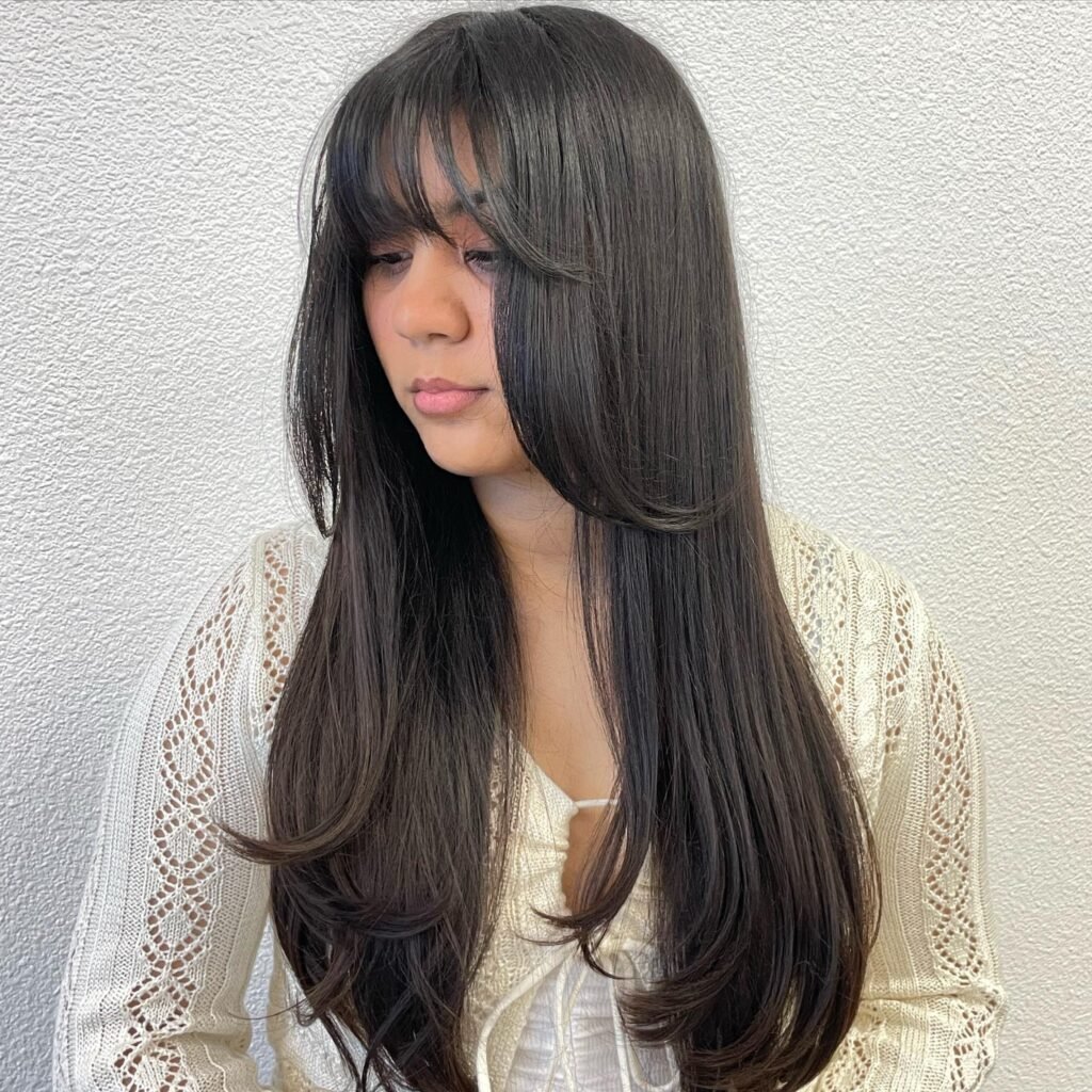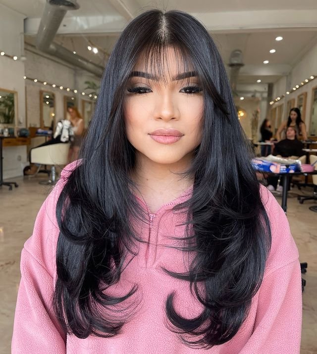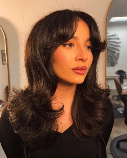 The soft curtain bangs and voluminous, feathered layers define this hairstyle. Use a round brush and a blow dryer to create that voluminous shape in the bangs, while a smoothing serum will tame frizz. For the ends, finish with a light-hold hairspray to keep everything in place without weighing down the layers.