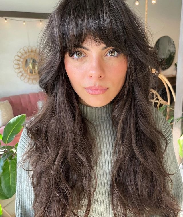 This style showcases long, layered waves with voluminous curtain bangs for a balanced, yet bold look. Apply a volumizing spray to the roots before blow-drying with a round brush to lift the bangs. Finish the look with a light-hold hairspray to keep the soft waves in place and maintain movement.