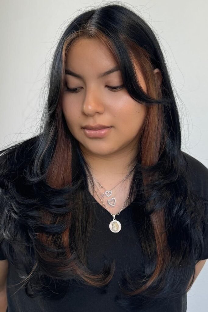 Mocha peekaboo panels create a playful contrast that looks bold only when your hair moves, making it perfect if you want something fun without a full-color commitment.