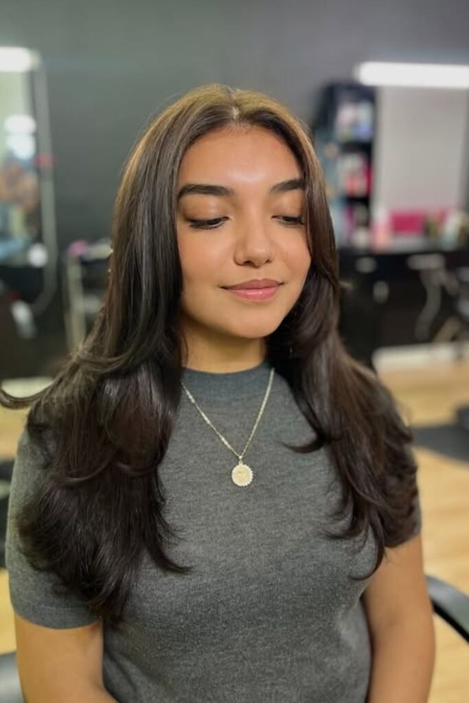 Long layers allow the color flow smoothly, making the mocha tone look light and airy in natural light.