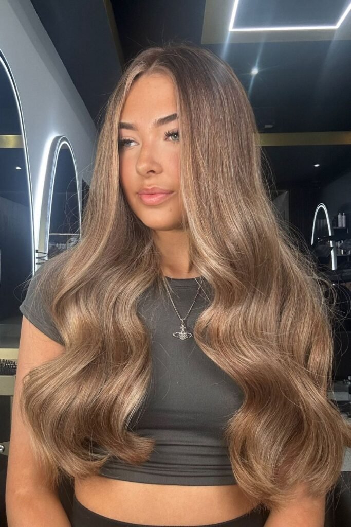 Beige mocha brings a soft, neutral brightness that looks effortless on long, layered hair.
