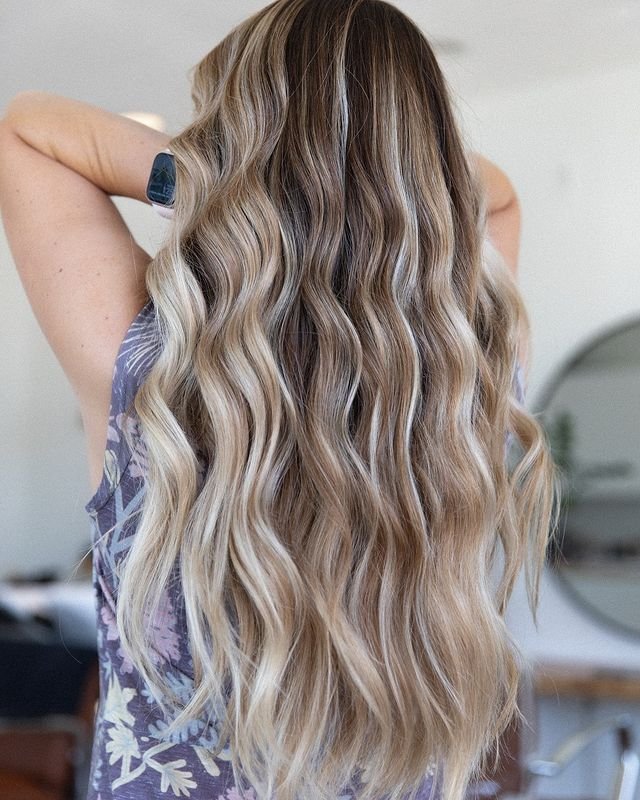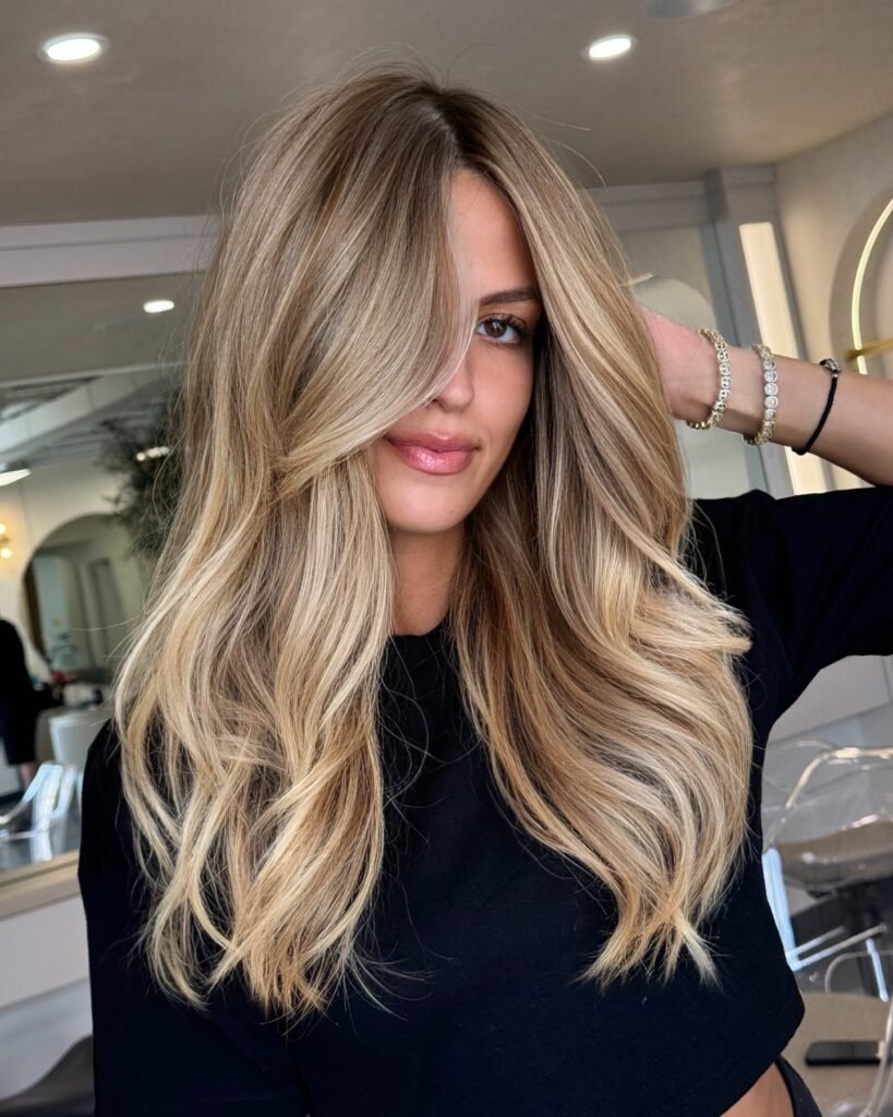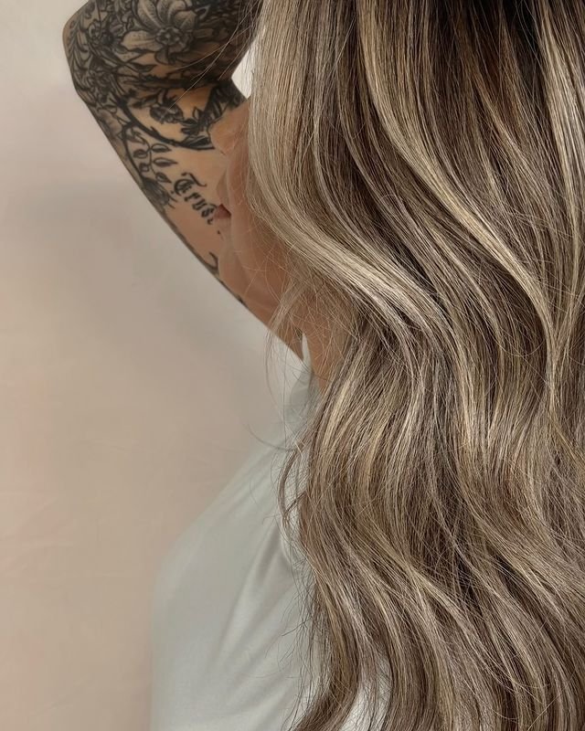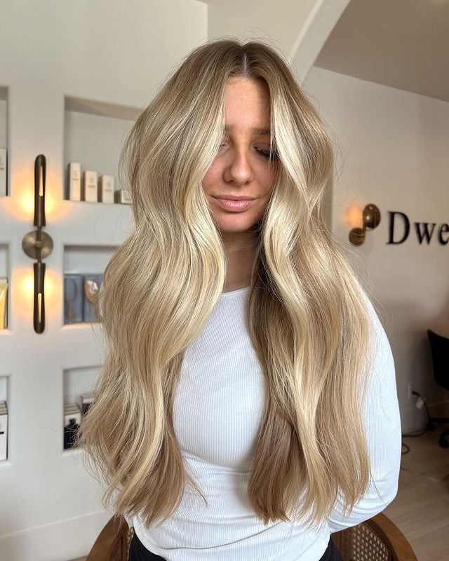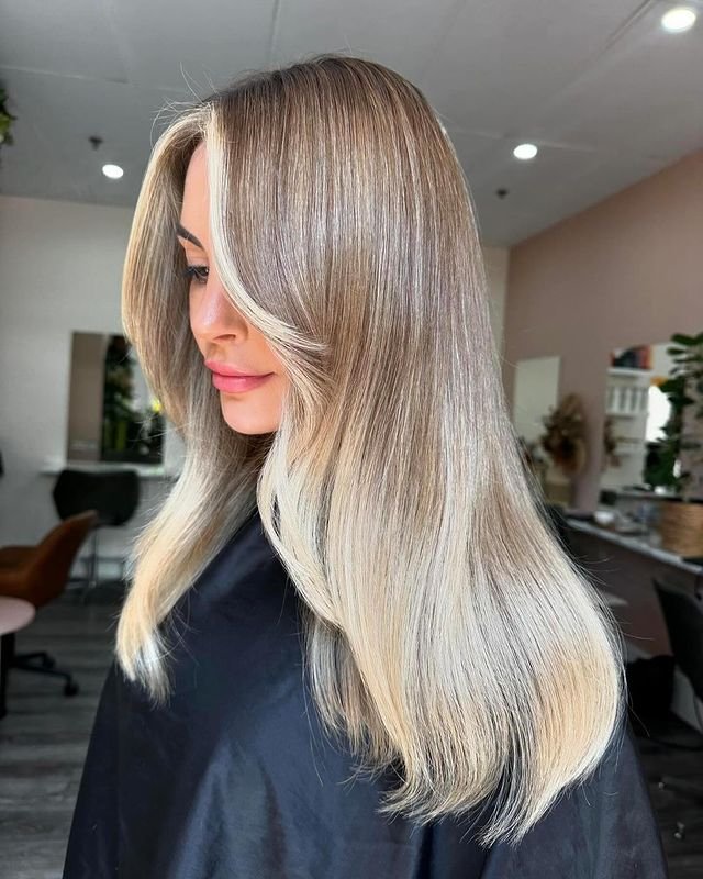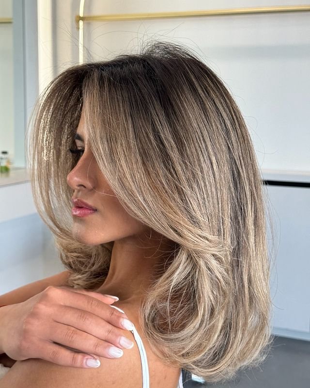 For a dynamic rooted mushroom blonde look, this balayage features dark roots transitioning into earthy blonde ends. Achieve this with Matrix SoColor 6N for the roots and L’Oreal Dia Light 9.13 for the blonde sections. Complete the style with Olaplex No. 6 Bond Smoother to maintain softness and shine.