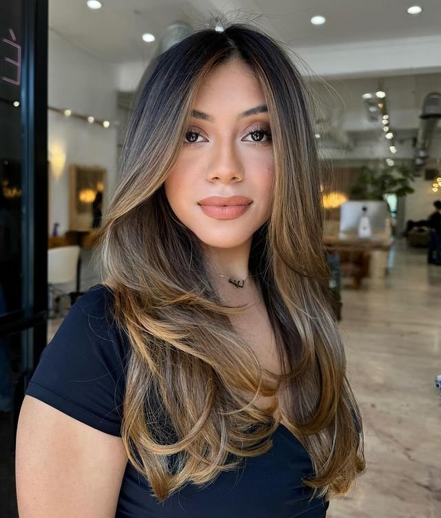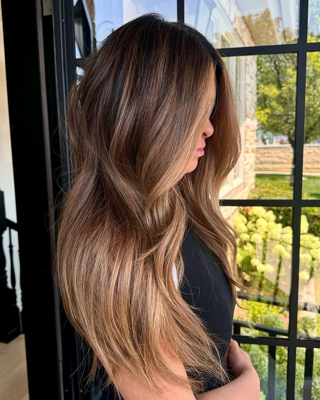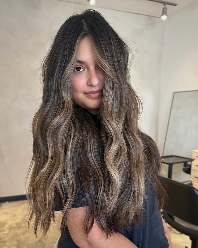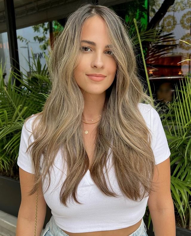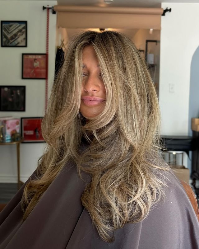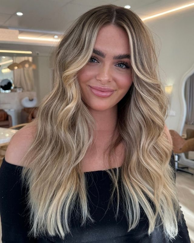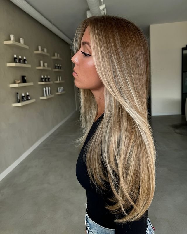For a dynamic rooted mushroom blonde look, this balayage features dark roots transitioning into earthy blonde ends. Achieve this with Matrix SoColor 6N for the roots and L’Oreal Dia Light 9.13 for the blonde sections. Complete the style with Olaplex No. 6 Bond Smoother to maintain softness and shine.