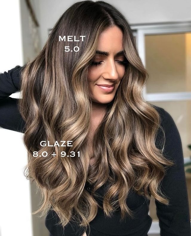 This look blends earthy tones with mushroom blonde highlights for rich, dimensional depth. Start with Wella Koleston Perfect 6/1 for the base and lighten the ends using L’Oreal Majirel 9.13. To add a polished finish, apply Moroccanoil Glimmer Shine for lasting radiance.