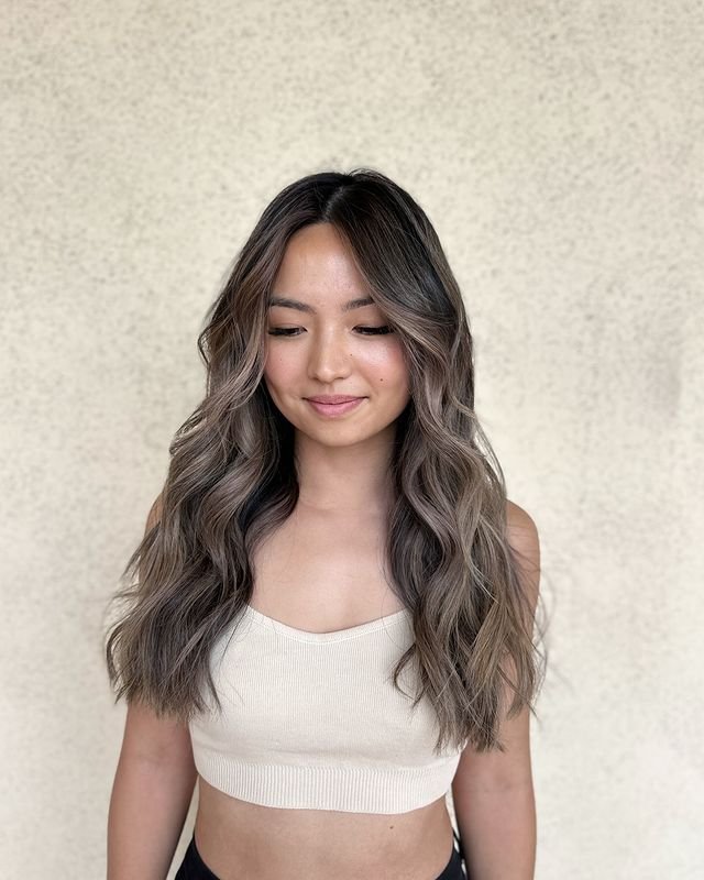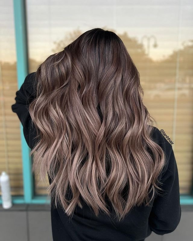 This smoky ombre transitions from dark roots to soft mushroom blonde ends, creating a chic gradient. Start with L’Oreal Inoa 4.1 for the roots and blend into Matrix SoColor 8N for the lengths. Complete the look with Olaplex No. 7 Bonding Oil to add shine and protect from heat damage.