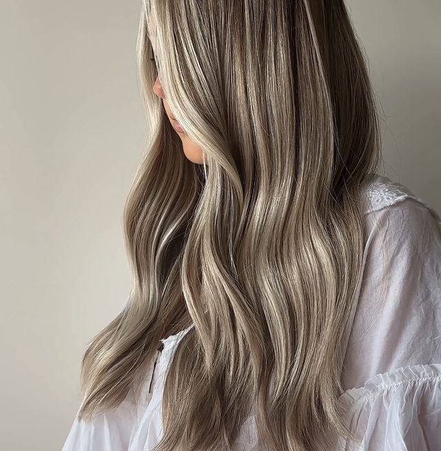 These sleek highlights combine mushroom blonde with a subtle, smooth finish. Use Wella Koleston Perfect 8/1 for the base and enhance with Redken Flash Lift Blonde Idol for light-reflecting highlights. Finish with Paul Mitchell Super Skinny Serum to maintain a sleek, frizz-free look.