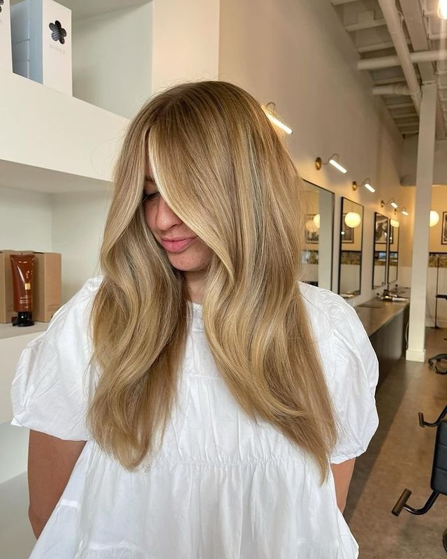 This hair color blends golden honey and subtle mushroom tones for a warm yet neutral result. To achieve this look, use Wella Color Charm Permanent Liquid Hair Color 8N for the base and Redken Shades EQ Gloss 09NB for added shine and dimension. This combo creates a natural blonde look with soft, multi-dimensional tones perfect for a sun-kissed effect.