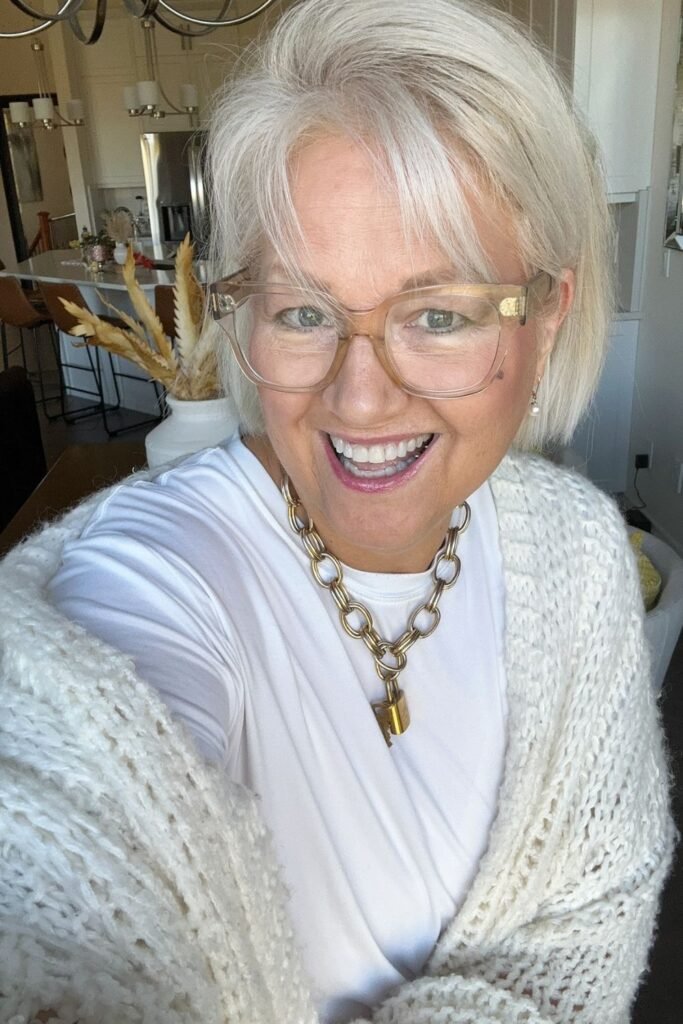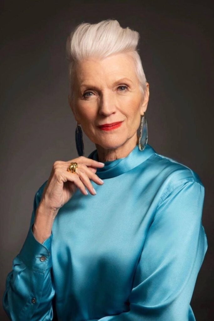 Pulling the hair back this smoothly instantly sharpens your features in the best way, and it works beautifully when your hair has a natural silver tone.